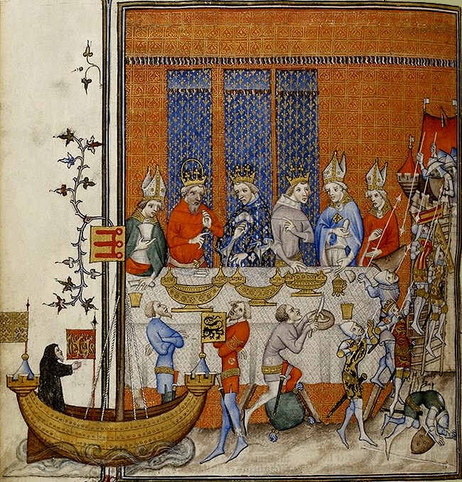 Item ce iour au souper sist le roy en la grant sale du palais a la grant table de marbre et les princes qui auoient dine aueques lui et tous les autres signeurs furent assis chascun selonc leur estat.