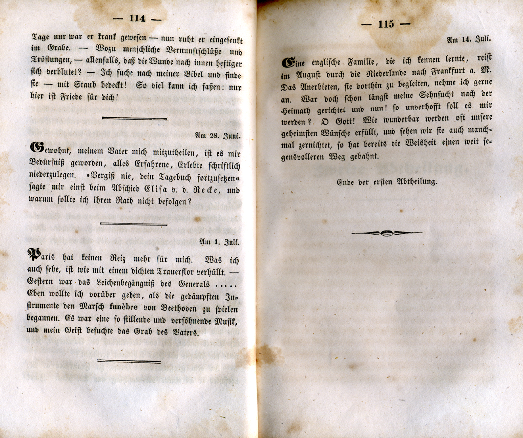 Am 14. Juli.Eine englische Familie, die ich kennen lernte, reist im August durch die Niederlande nach Frankfurt a. M. Das Anerbieten, sie dorthin zu begleiten, nehme ich gerne an. War doch schon längst meine Sehnsucht nach der Heimath gerichtet und nun! so unverhofft soll es mir werden? O Gott! Wie wunderbar werden oft unsere geheimsten Wünsche erfüllt, und sehen wir sie auch manchmal zernichtet, so hat bereits die Weisheit einen weit segensvolleren Weg gebahnt.Ende der ersten Abtheilung.―――――― |