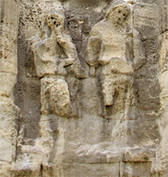 Auf der Nebenseite des Riesenbaues zwei Figuren in Lebensgröße, das Haupt der einen abgestumpft, das der andern so durch die Zeit ausgehöhlt, daß man einen Todtenkopf zu sehen glaubt. |
