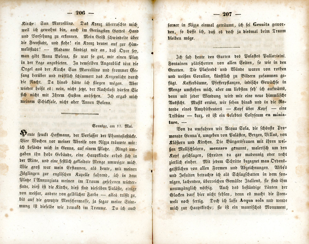 Kirche: San Marcellino. Das Kreuz überraschte mich, weil ich gewohnt bin, auch im Geringsten Gottes Hand und Vorsehung zu erkennen. Mein Geist schwindelte über die Feenstadt, und siehe! ein Kreuz deutet auf zur Himmelsstadt! – Madame kündigt mir an, daß Oper sey, man gibt Anna Bolena, sie war so gut, mir einen Platz in der Loge anzubieten. In demselben Augenblick tönt die Orgel aus der Kirche San Marcellino und frommer Gesang herüber und tröstlich schimmert das Kerzenlicht durch die Nacht. Da hinab hätte ich fliegen mögen. Aber wieder heißt es: nein, nicht jetzt, der Nachtluft dürfen Sie sich nicht mit Ihrem Husten aussetzen. Ich ergab mich meinem Schicksale, nicht aber Annen Bolena.―――――Sonntag, am 17. Mai.Heute spuckt Hoffmann, der Verfasser der Phantasiestücke. Vier Wochen vor meiner Abreise von Nizza träumte mir: ich befände mich in Genua, auf einem Platze. Rings umgaben ihn hohe Gebäude, eine Hauptkirche erhob sich in der Mitte, und eine festlich gekleidete Menge umwogte mich. Wie groß war mein Erstaunen, als heute, mit meinen Zöglingen zur englischen Kapelle fahrend, ich in dem Platze l'Annunziata meinen im Traum gesehenen wiederfinde, dieß ist die Kirche, dieß sind dieselben Paläste, einige von weißer, andere von gelblicher Farbe – alles trifft zu, bis auf die geputzte Menschenmasse, ja sogar meine Stimmung ist dieselbe wie damals im Traume. Da ich auch |