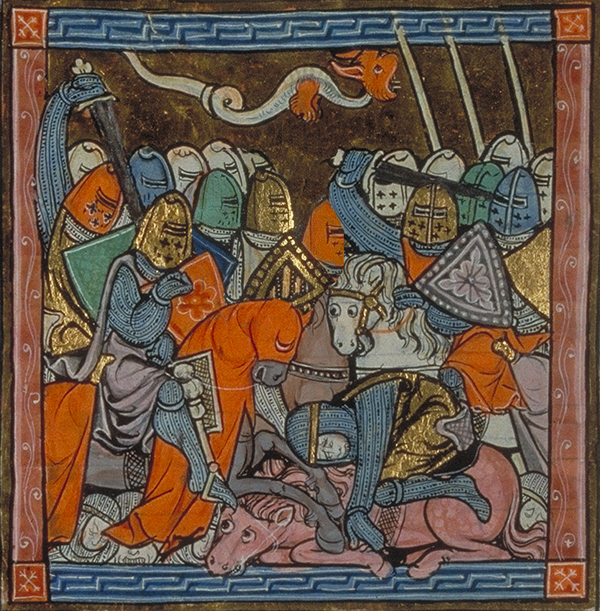Am dritten Tage, der hell und klar aufging, ordnete Pendragon ein Heer in Schlachtordnung. Die Heiden, die mit Schrecken sich von den beyden Heeren eingeschlossen, und ihre mißliche Lage einsahen, stellten sich auch in Ordnung, weil sie nicht anders konnten, als sich vertheidigen, so lange als möglich. Nun erschien der Drache in der Luft, den Merlin dem Könige prophezeihete. Er war wunderbar anzuschauen, und Feuer strömte aus seiner Nase und aus dem Munde, so daß alle sich entsetzten, die ihn sahen. Der König ließ sogleich die Trompeten ertönen, und rief, daß man den Feind anfalle und alles ohne Gnade niedermache. Uter ließ dasselbe in seinem Lager [148] geschehen, und so fielen sie beyde mit ihren Heeren zu gleicher Zeit in den Feind. Uter und die Seinigen fochten so tapfer, daß endlich die Heiden unterlagen. König Pendragon aber ward erschlagen, nebst vielen andern Herren des Reichs mehr. Keiner konnte sagen, welcher von beyden sich tapferer gehalten, ob Uter, oder Pendragon; wir finden aber, daß Uter und sein Heer alle Heiden erschlugen, daß er das Feld behielt, und diesen Tag den vollkommensten Sieg davon trug.
