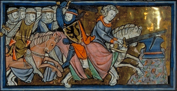 Am Neujahrstage nach der Mahlzeit hielten die Fürsten und Baronen schöne Ritterspiele und Rennen, zur Ergötzlichkeit, auf einem schönen Platze außerhalb der Stadt. Da dieß die Ritter und die andern Leute in der Stadt vernahmen, machte sich ein jeder bereit, auch hinauszugehen, um bey den Spielen zu seyn, und die Bürger der Stadt gingen fröhlich hinaus, um diesen Spielen zuzuschauen. Als die Männer, welche das Schwerdt bewachten, sahen, daß alles in der Stadt hinaus lief, gingen sie mit, und ließen auf diese Weise das Schwerdt unbewacht. Der gute Ritter Anthor befand sich gerade vor der Stadt, als [227] diese Spiele begonnen, nebst seinem Sohn, der am Allerheiligen Tage war Ritter geworden, und welcher Lreux genannt wurde, und nebst Artus, seinem Pflegesohn, der so, wie jeder, glaubte, Lreux's wirklicher Bruder zu seyn, und ihn auch als einen ältern Bruder liebte und ehrte. Da nun die Spiele angingen, befahl Lreux seinem Bruder Artus, eilends nach Hause zu laufen und ihm sein Schwerdt zu holen, welches er daselbst hatte liegen lassen. Dienstbar und gefällig ritt Artus sogleich eilends hin, um den Befehl eines Bruders zu vollziehen; als er aber in dem Gasthof ankam, in welchem sie wohnten, fand er alles verschlossen und niemand, der ihm öffnete, weil alle Hausleute gleichfalls hinaus gegangen waren, den Spielen zuzusehen.