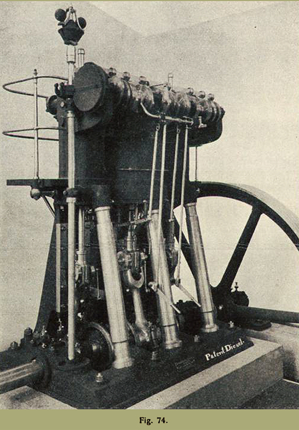 Da die konstruktiven Einzelheiten der Compoundmaschine, soweit die Verbrennungszylinder in Betracht kamen, genau diejenigen des Einzylindermotors entsprachen, und da die ganze Anordnung nicht zu praktischer Bedeutung gelangte, so unterlasse ich es an dieser Stelle, Ausführungszeichnungen wiederzugeben, aber die Figuren 74 und 75 geben photographische Ansichten dieser Maschine von verschiedenen Seiten und Fig. 76 zeigt sie im Laboratorium neben dem Einzylinderversuchsmotor. [134]