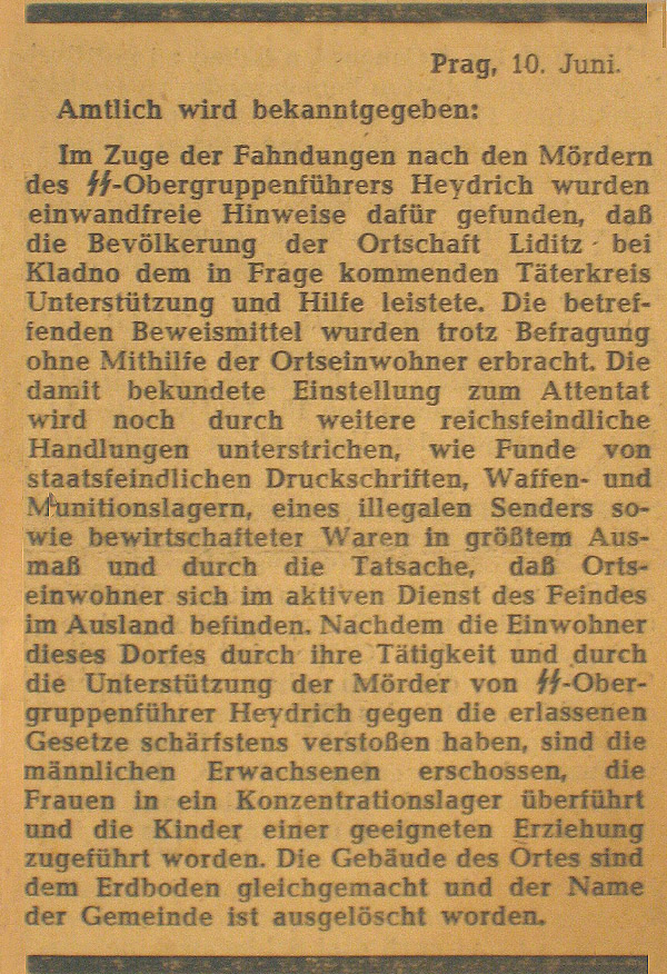Bekanntmachung über die Zerstörung Lidices, erschienen in der deutschen Besatzungszeitung