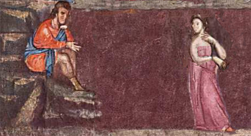 15 | μαίνετο μέν τ᾽ αὐτά, μαίνοντο δ᾽ ἄρ᾽ εὐθὺ καὶ ἅλλαι.Πενθεὺς μὲν φεῦγεν πεφοβημένος, αἳ δ᾽ ἐδίωκον,πέπλως ἐκ ζωστῆρος ἐς ἰγνύαν ἐρύσαισαι.Πενθεὺς μὲν τόδ᾽ ἔειπε· «τίνος κέχρησθε γυναῖκες; »Αὐτονόα τόδ᾽ ἔειπε· «τάχα γνώσηι πρὶν ἀκοῦσαι.» |