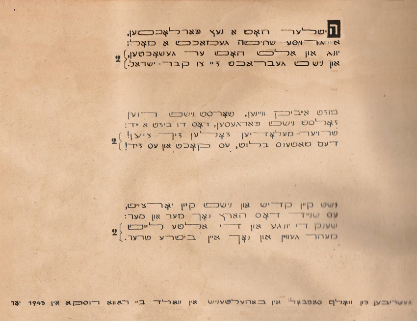 Hitler hot a nez farflochten,a grojse schchite gemacht a mol:Jung un alt hot er geschochtenund nischt gebracht saj zu kewer-jisrol.