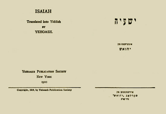 Yeshaye, iberzetst fun Yehoash aroysgegeben fun farlag «Yehoash» Nyu York Isaiah Translated into Yiddish by Yehoash. Yehoash Publication Society New York 1910