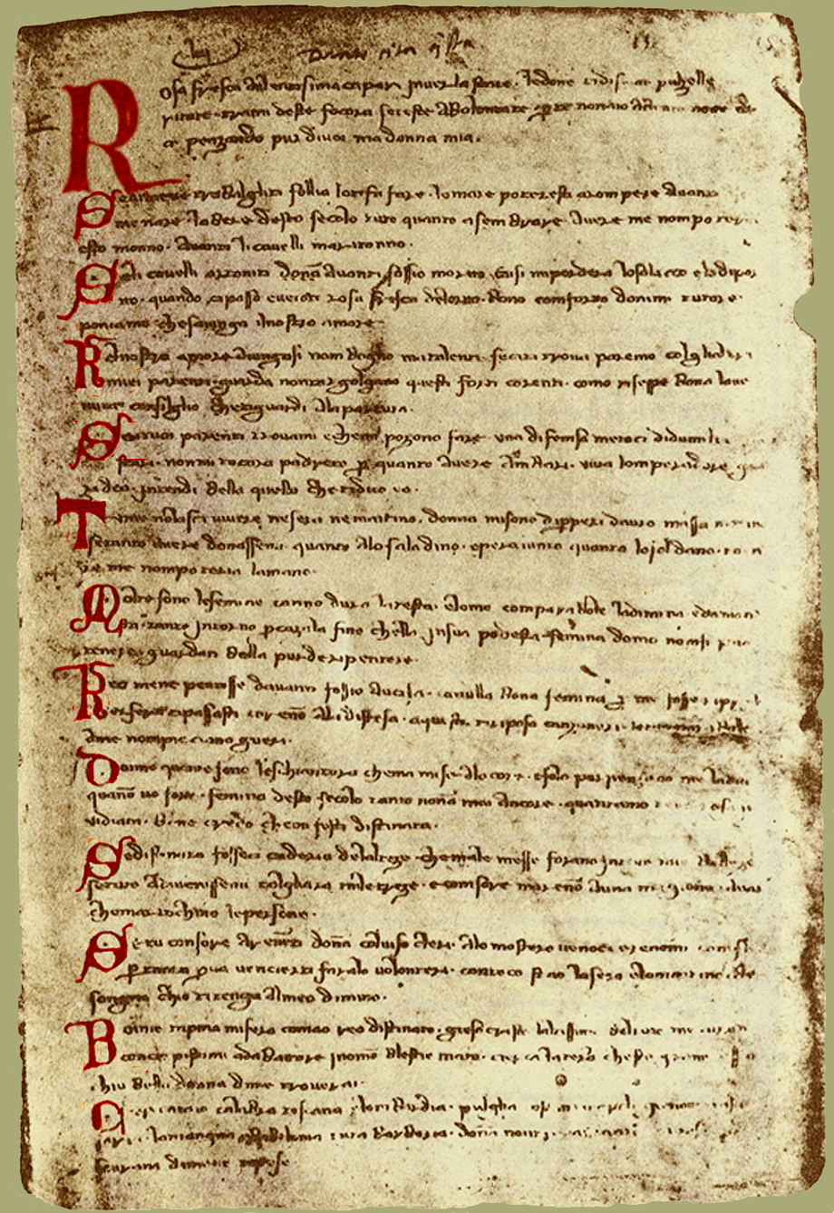 Donna K'eo ne [pur ri]pentéssende? davanti foss'io aucisaca nulla bona femina per me fosse riprisa![A]ersera passàstici, cor[r]enno a la distesa.Aquístati riposa, canzonieri: |