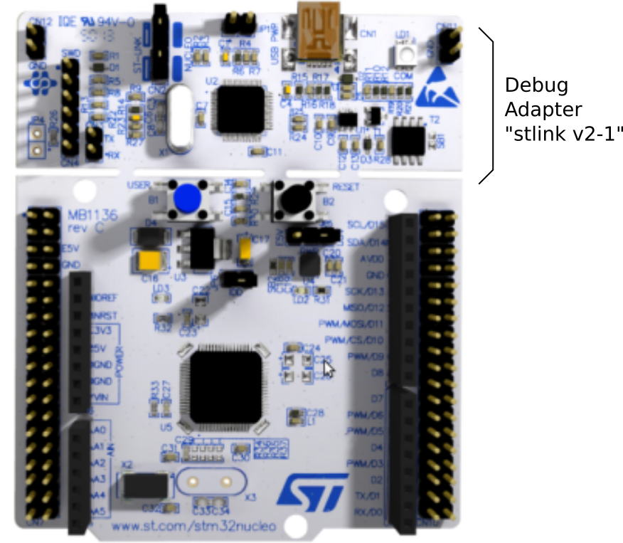 STM32L476 Nucleo Board (aus UM1724). Der obere Teil des Boards ist ein STLINK V2-1 Debug-Adapter. Der untere Teil enthält die Target MCU STM32L476RG.