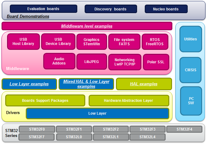 STM32Cube Overview The diagram comes from Release Notes for STM32CubeL4 Firmware Package, which is contained in the Cube package.