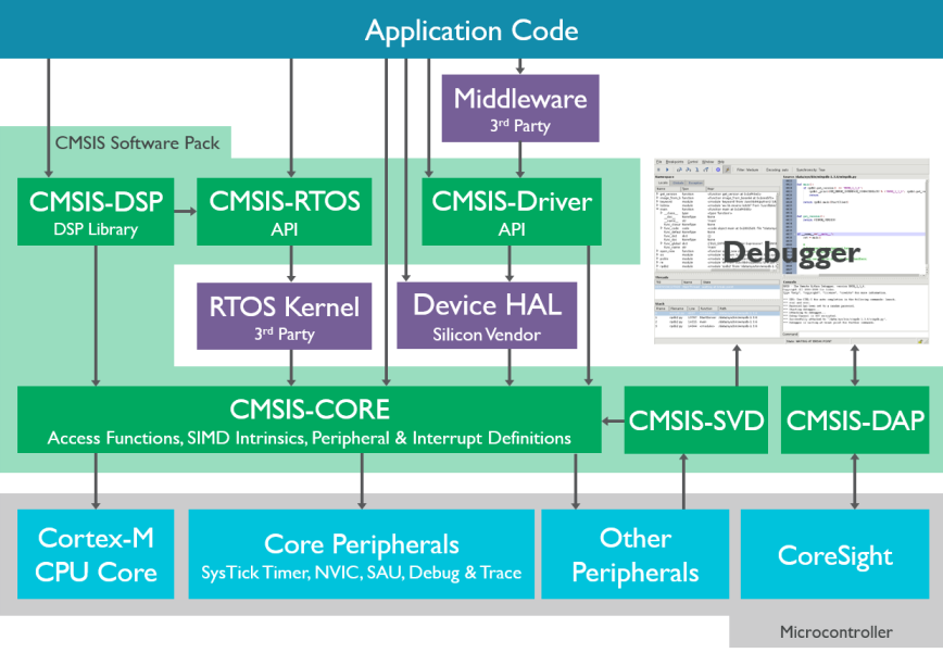 CMSIS: Abstraction of the Cortex M3 core and core peripherals. In addition a vendor specific part abstracts the microcontroller peripherals. CMSIS consists of a bunch of C header files.