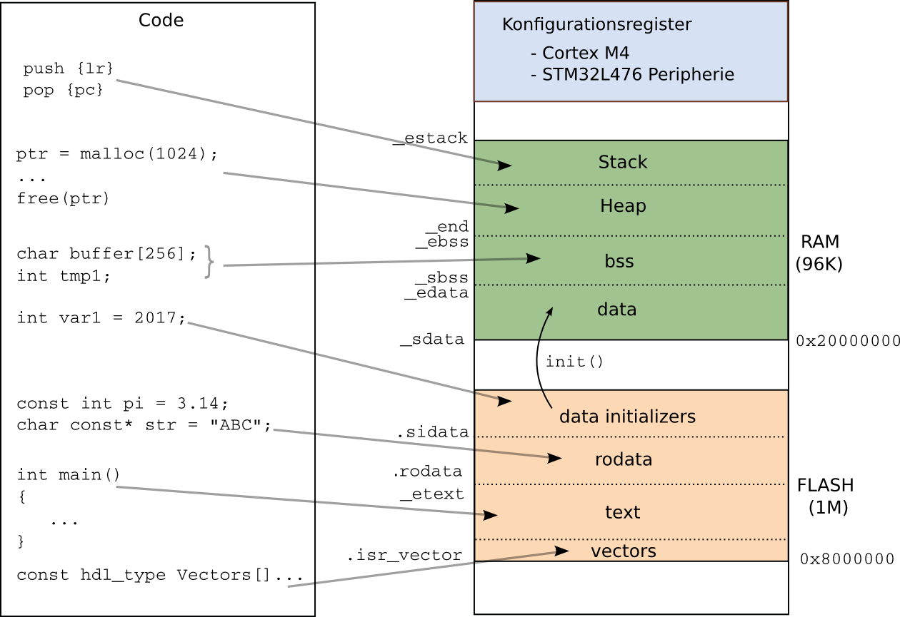 In Figure 5.1 you see the different FLASH and SRAM sections of the STM32L4. Also have a look at the “starter” source code: