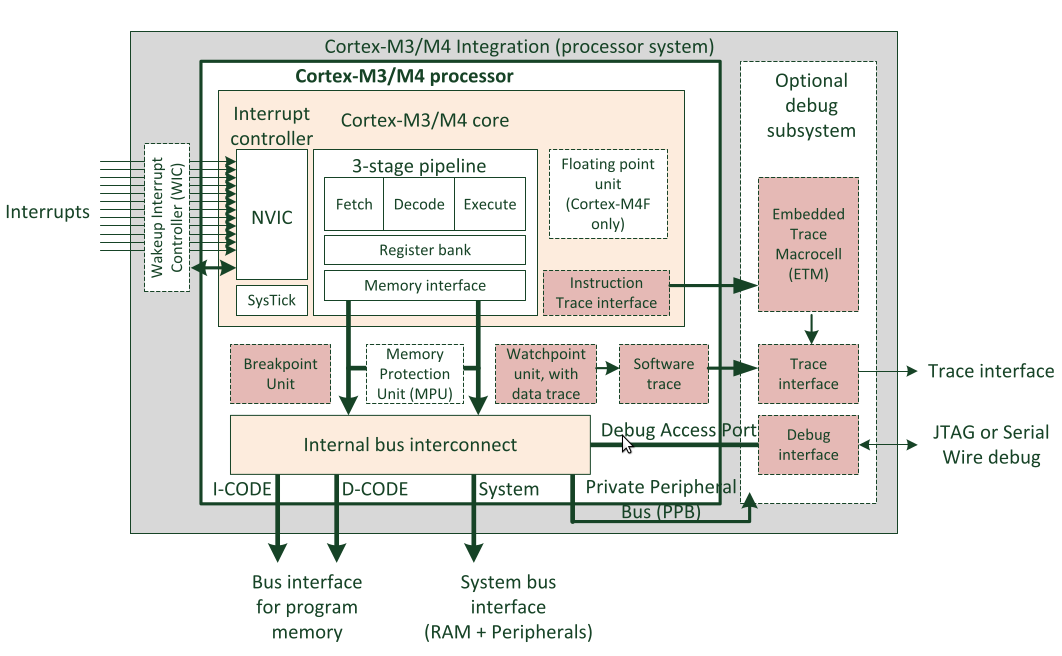 Block diagram of Cortex M3 and M4 coreBlock diagram of Cortex M3 and M4 core (taken from [YIUDG], p. 62). Additional blocks not shown: SCB, Debug (ITM/FPB).