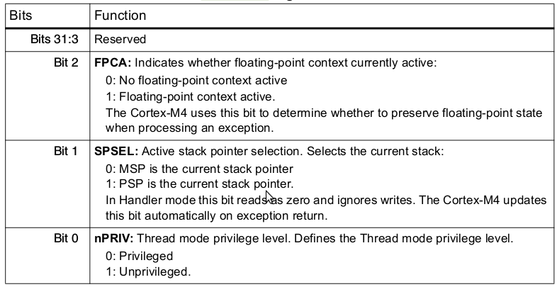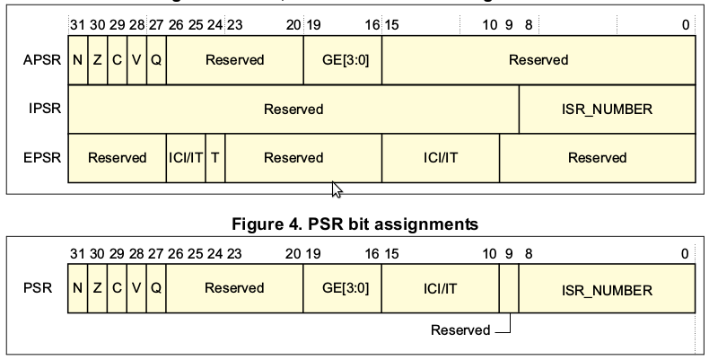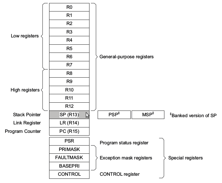 old SP (N) ----> xPSR PC LR R12 R3 R2 R1 new SP (N-32) ----> R0“Caller saved” registers according to ARM Architecture Procedure Call Standard: R0-R3, R12, LR, PC, PSR.