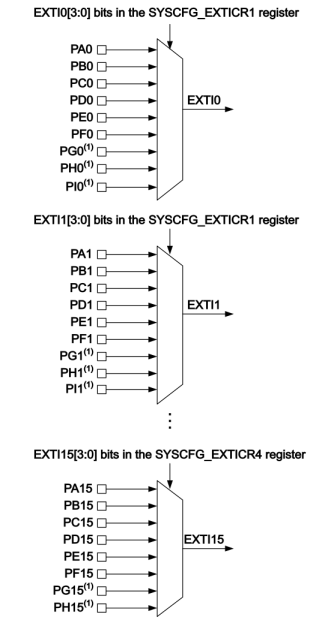 Configurable interrupt/event block diagramExternal GPIO pin to EXTI mapping (taken from [STM32L4RM], ch. 14: “EXTI”). The SYSCFG_EXTICR1 to SYSCFG_EXTICR4 registers are located in the System Configuration Controller (SYSCFG), see [STM32L4RM], ch. 9.