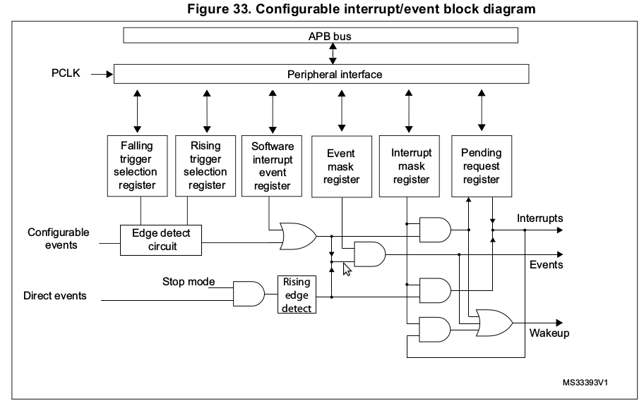 EXTI_IMR1 Interrupt Mask Register 1 EXTI_EMR1 Event Mask Register 1 EXTI_RTSR1 Rising Trigger Selection Register 1 EXTI_FTSR1 Falling Trigger Selection Register 1 EXTI_SWIER1 Software Interrupt Event Register 1 EXTI_PR1 Pending register 1 EXTI_IMR2 Interrupt Mask Register 2 EXTI_EMR2 Event Mask Register 2 EXTI_RTSR2 Rising Trigger Selection Register 2 EXTI_FTSR2 Falling Trigger Selection Register 2 EXTI_SWIER2 Software Interrupt Event Register 2 EXTI_PR2 Pending Register 2Block diagram (taken from [STM32L4RM], ch. 14: “EXTI”)