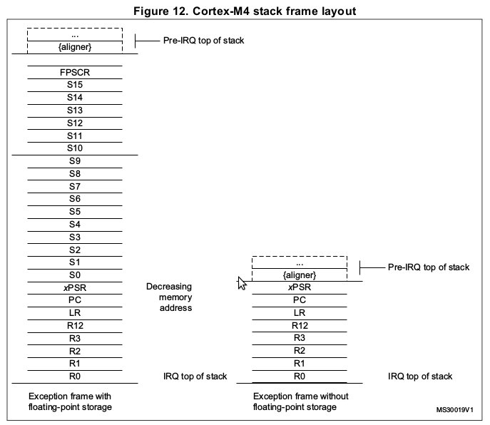 Cortex-M4 stack frame layout for non-floating-point state.