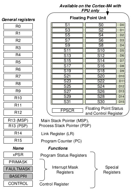 Cortex M4 Core Registers with FPU (taken from the Whitepaper “Cortex-M for beginners” by Joseph Yiu), see Chapter 9.Floating Point Unit (IEEE 754)