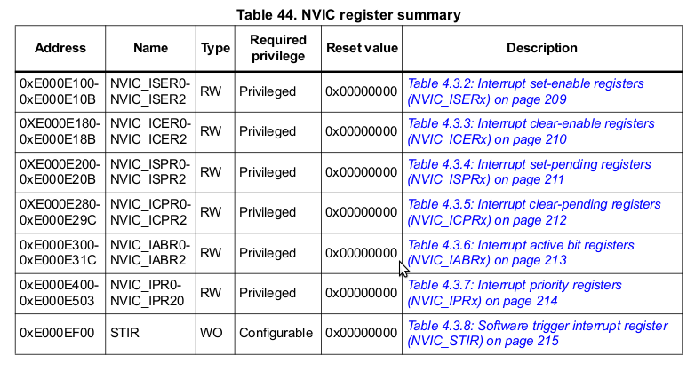 NVIC_ISER0 - NVIC_ISER7 Interrupt set-enable registers (8 x 32-bit) NVIC_ICER0 - NVIC_ICER7 Interrupt clear-enable registers (8 x 32-bit) NVIC_ISPR0 - NVIC_ISPR7 Interrupt set-pending registers (8 x 32-bit) NVIC_ICPR0 - NVIC_ICPR7 Interrupt clear-pending registers (8 x 32-bit) NVIC_IABR0 - NVIC_IABR7 Interrupt active bit registers (8 x 32-bit) NVIC_IPR0 - NVIC_IPR59 Interrupt priority registers (60 x 32-bit) PRI_239...PRI_0 STIR Software Trigger Interrupt Register