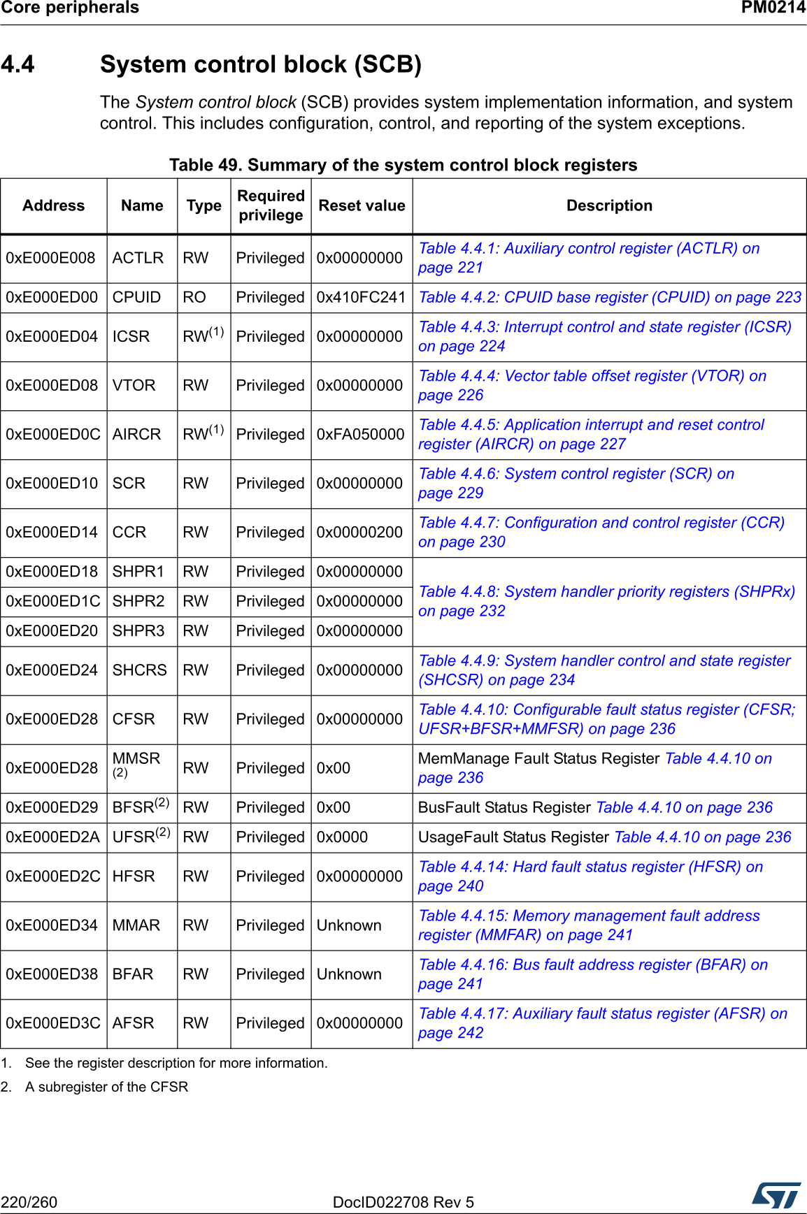 SCB System Control Block (also see Section 4.10 below).