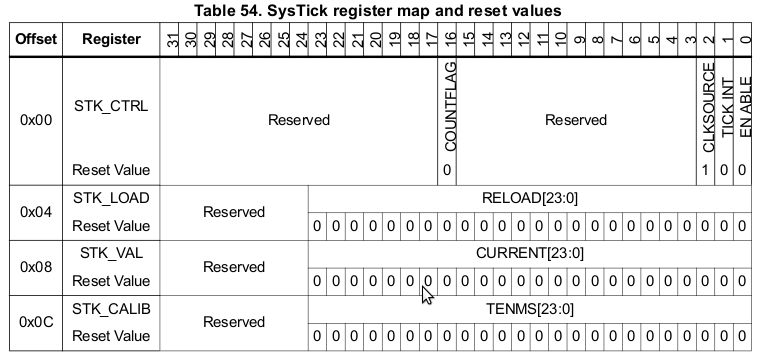 The processor has a 24-bit system timer, SysTick, that counts down from the reload value to zero, reloads (wraps to) the value in the STK_LOAD register on the next clock edge, then counts down on subsequent clocks.