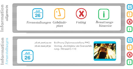 Zu 1: Aktuelle Veranstaltungen und Termine zum upload und download auf Screen und Handy Zu 2: Der Gebäudeplan liefert neben der Wegbeschreibung (grafisch ebenso wie in Schriftform) nützliche Informationen wie zum Beispiel Öffnungszeiten und Telefonnummern der einzelnen Sekretariate oder der Bibliothek. Alle Daten sind auf das Handy herunterladbar. Zu 3: Die Themenvorschläge kommen von den Studenten. Der Benutzer bekundet sein Interesse an einer Wahl via Handy. Danach wird ihm die Frage auf den Display geliefert. Die Wahl ist während des Votings geheim (das Ergebnis wird jedoch als Belohnung für die Teilnahme an einer Wahl auf dem Handy gezeigt). Nach Abschluss der Wahl wird das Ergebnis auf dem Public Screen veröffentlicht. |