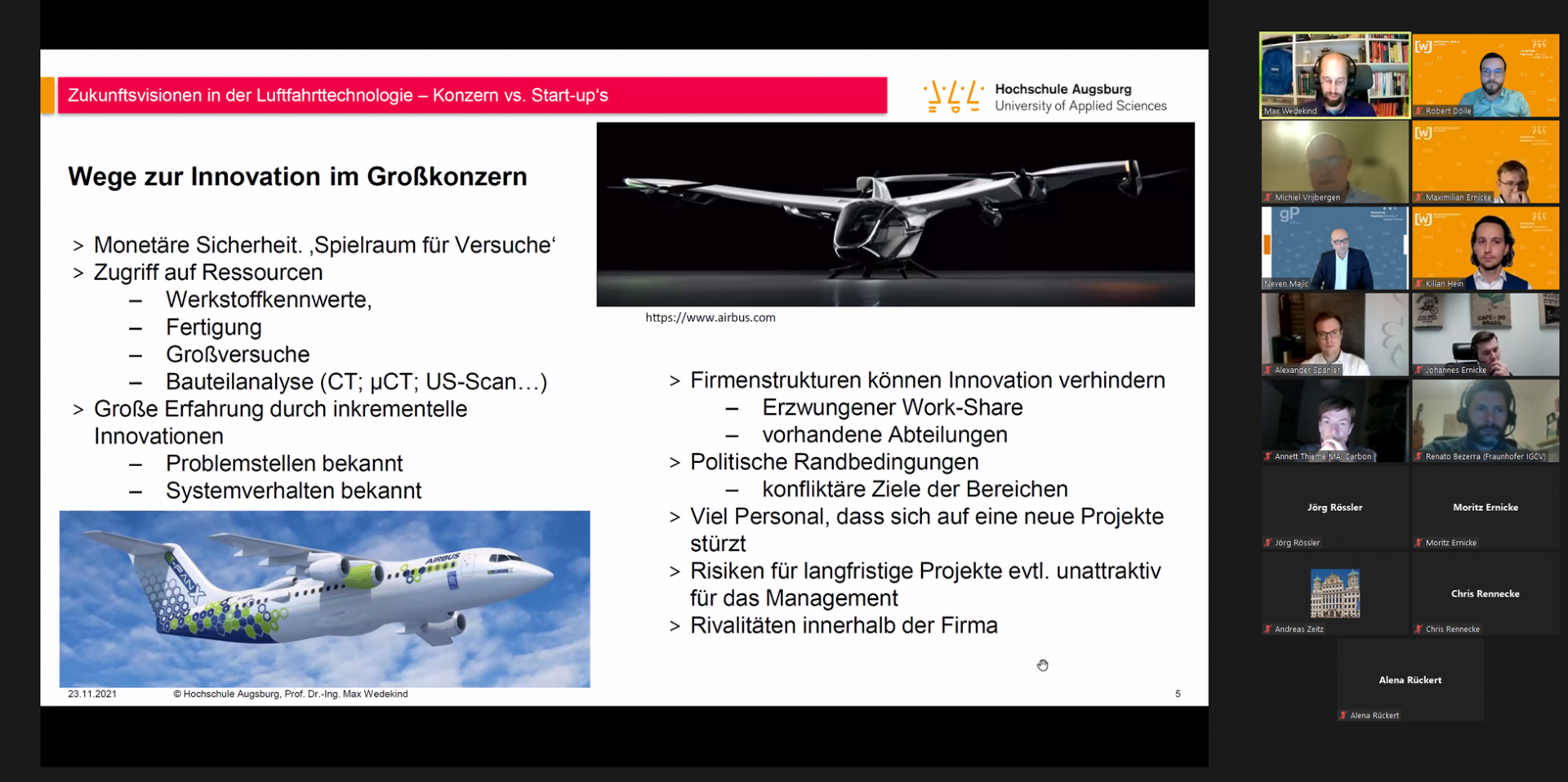 Die beiden Experten betrachteten den Einsatz von Faserverbundwerkstoffen im Bereich der Luftfahrttechnologie und verglichen hierbei die unterschiedlichen Herangehensweisen bei Start-ups und Konzernen. Einen vertieften Praxiseinblick lieferte der Wirtschaftsjunior Michiel Vrijbergen, A350 Composite Stress Engineer bei Premium Aerotec.