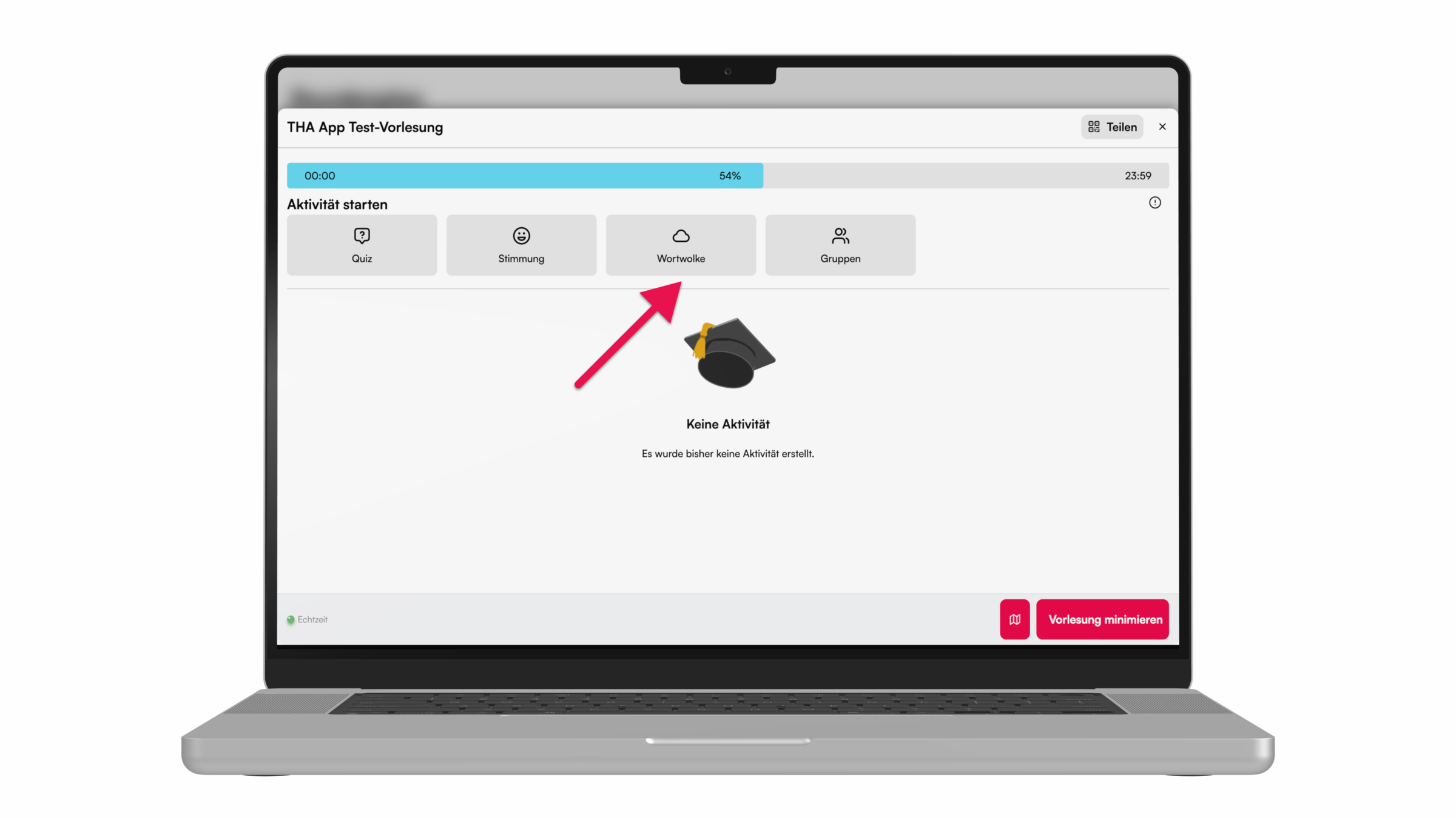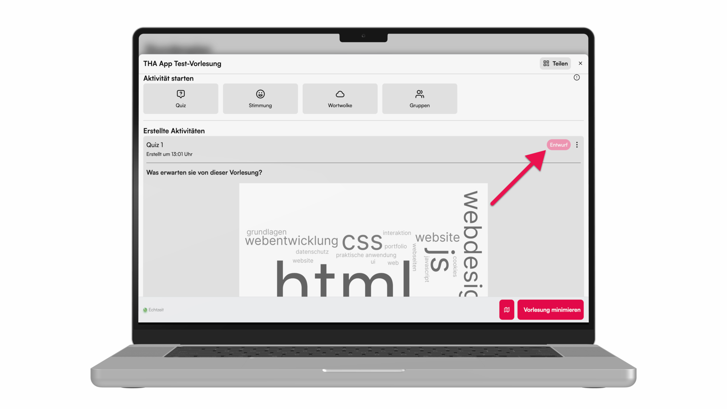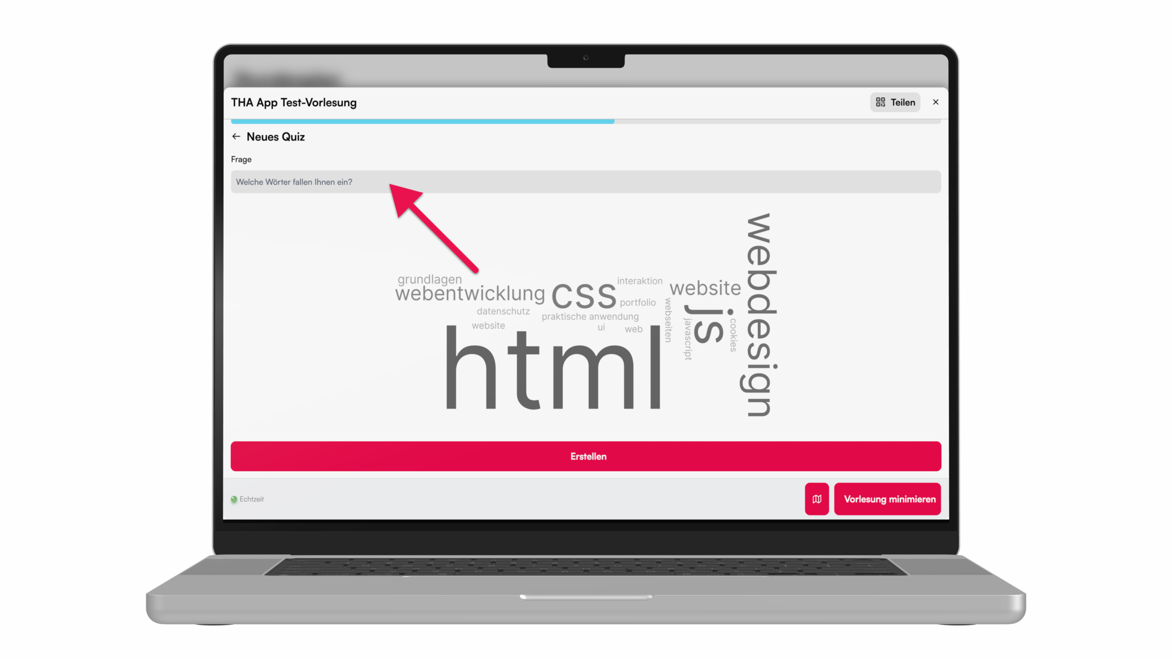 Für ein Brainstorming während der Vorlesung, kann eine Abfrage mit der Wortwolke durchgeführt werden. Hier zeigen wir, wie's geht.
