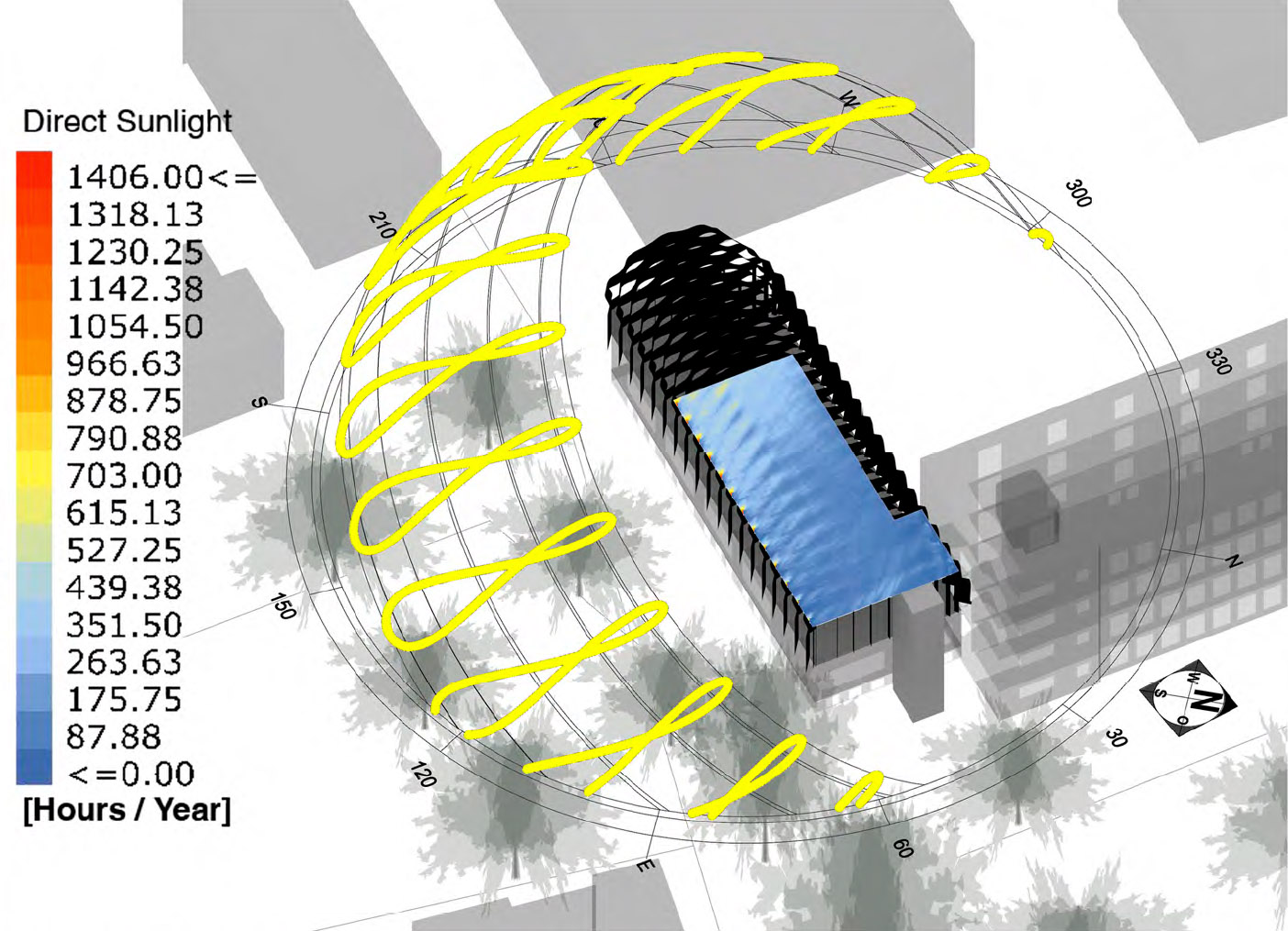 Cholakov entwickelt dabei ein filigranes Schalentragwerk aus gebogenen Holzelementen, um die vielfältigen Nutzungen unter einem Dach zu vereinen. Die Geometrie dieser Konstruktion schafft ein Gleichgewicht zwischen zwei Faktoren, die sich üblicherweise widerstreben: Die Notwendigkeit von Tageslichteintrag einerseits und das Vermeiden direkter Belichtung und zu großer solarer Wärmeeinträge andererseits, die zu unbehaglich hohen Innenraumtemperaturen bereits in Frühjahr und Herbst führen könnten. Die natürliche Belichtung der Arbeitsbereiche wurde unter Berücksichtigung der Lage und der ortsspezifischen baulichen Rahmenbedingungen simuliert. Die optimale Größe und Ausrichtung der Öffnungen bestimmte eine parametrische Optimierungsfunktion in Abhängigkeit der lokalen klimatischen Verhältnisse. Auf diese Weise konnte der Energiebedarf für künstliche Belichtung ebenso minimiert werden wie der einer sommerlichen Kühlung.