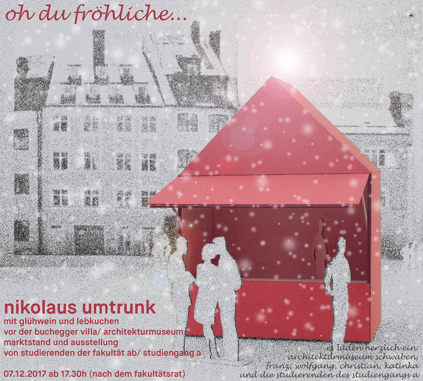 Herzlich wird eingeladen zum geselligen Nikolausumtrunk im Architekturmuseum Schwaben in einem Marktstand, der von unseren Studierenden entworfen und entwickelt wurde, mit einer Ausstellung von Erstsemesterarbeiten und, na klar, Glühwein und Lebkuchen.