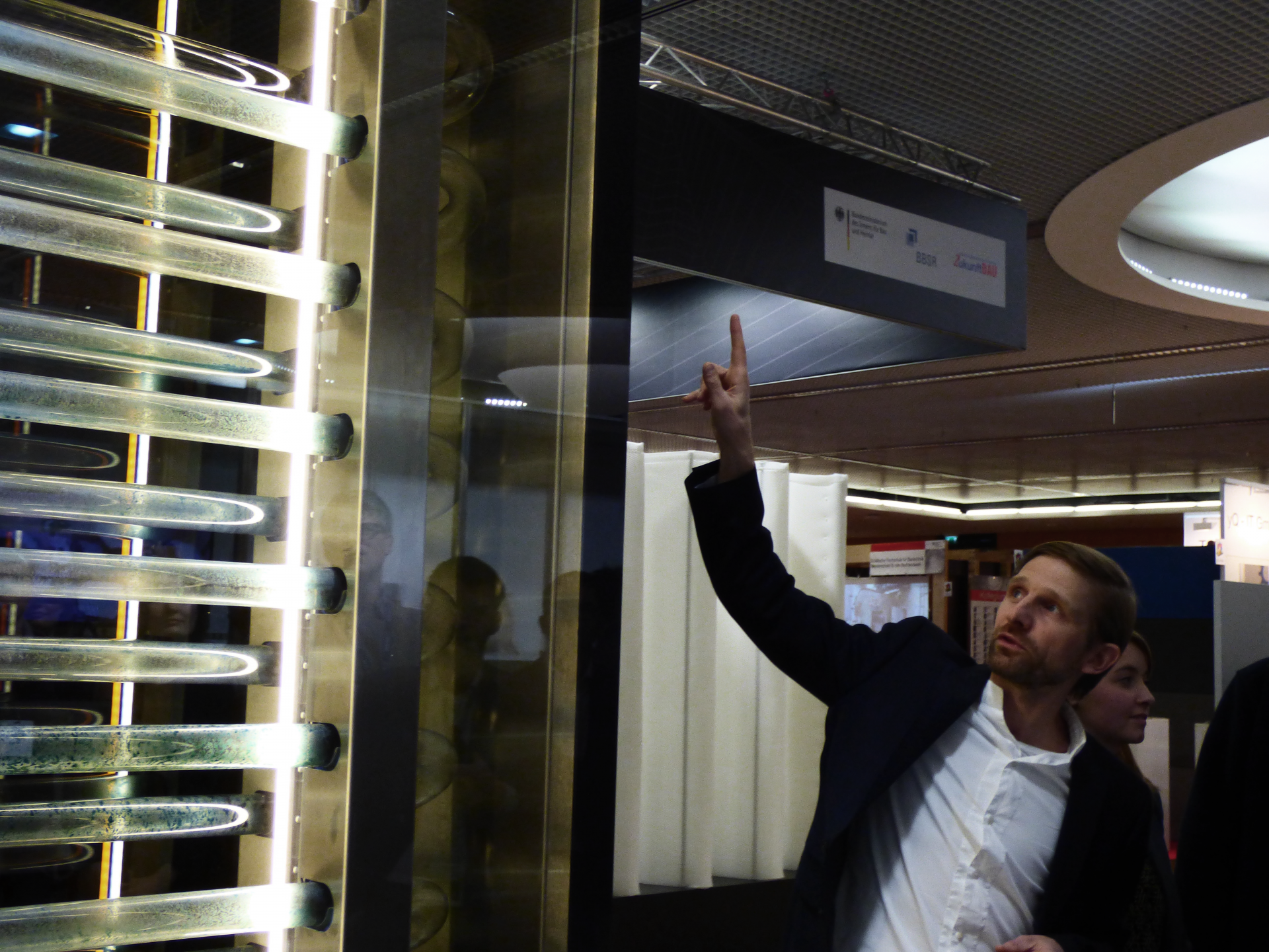 Noch bis Samstag (19. Januar 2019) kann der Photobioreaktor am Stand des DETAIL Research Lab (B0.204) besichtigt werden. Die Weiterentwicklung der Technologie erfolgt über eine Zusammenarbeit mit der Firma Wicona im Rahmen eines MAPR-Projektes mit der Studentin Carmen Herrmann.