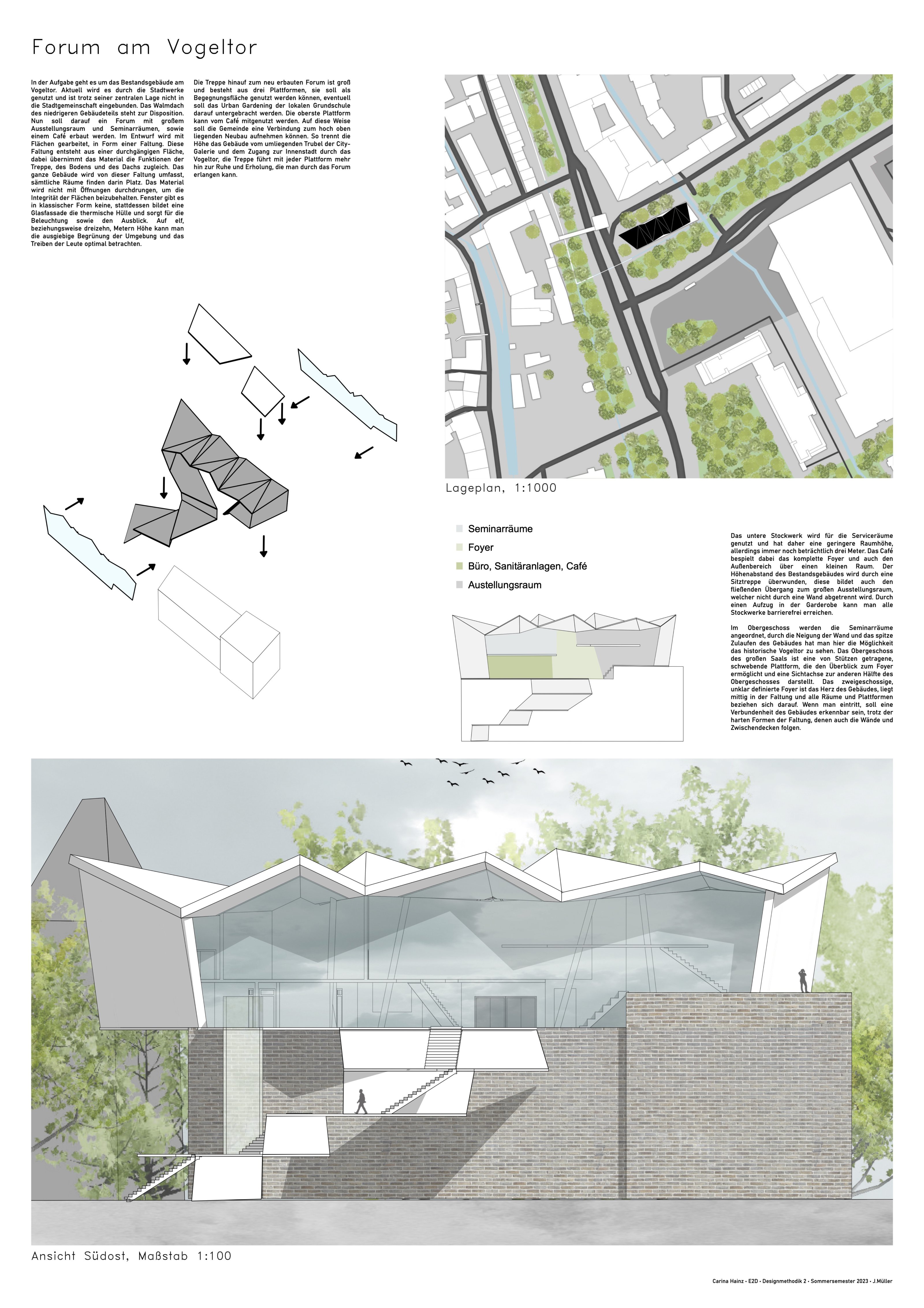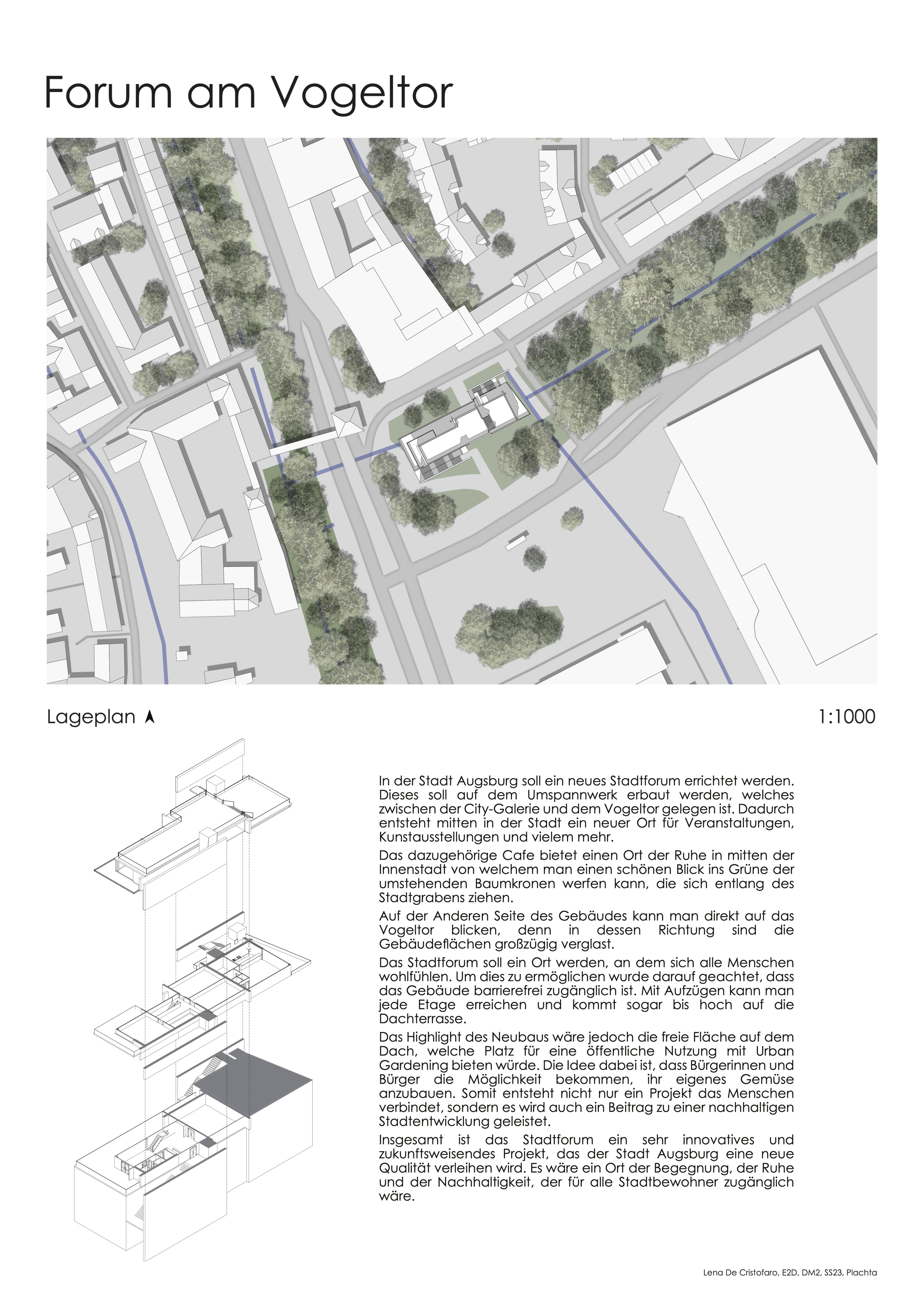 Zu entwerfen ist in diesem Kontext ein neuer Veranstaltungsort als „Bürger:innen-Forum“. Das Programm umfasst ein Foyer, einen flexiblen Aussstellungsbereich für wechselnde Themen, 2 Seminarräume, 2 Büros sowie ein öffentliches Cafe. Die Außenbereiche/ Dachflächen sind im Sinne einer gemeinschaftlichen Nutzung in die Planung mit einzubeziehen.