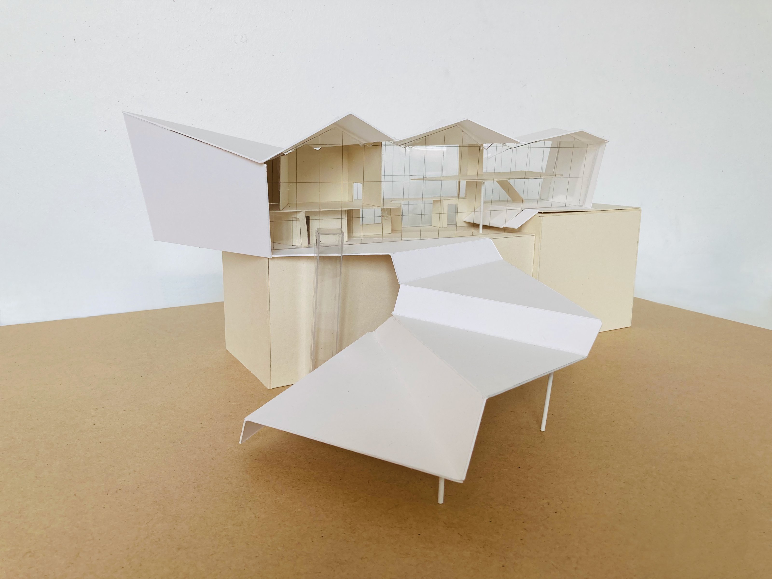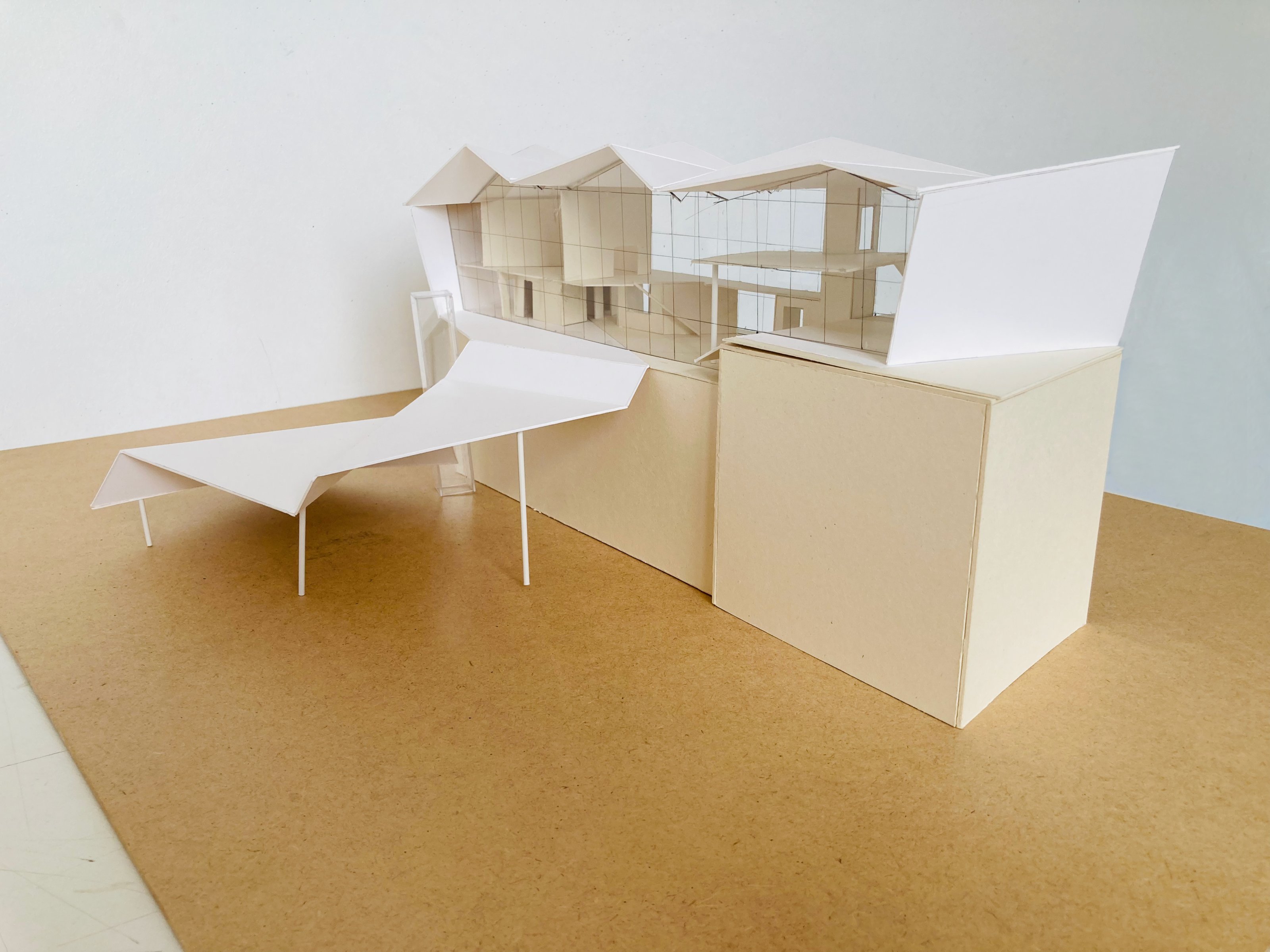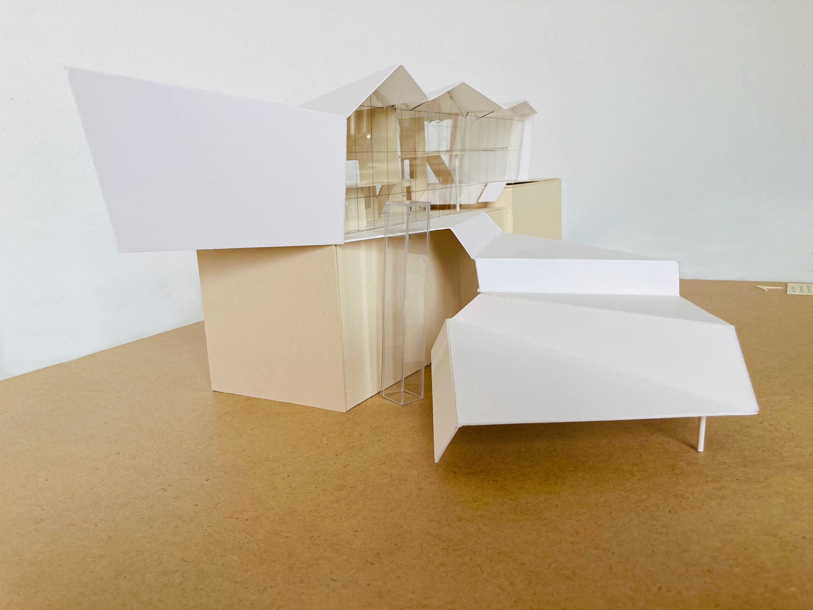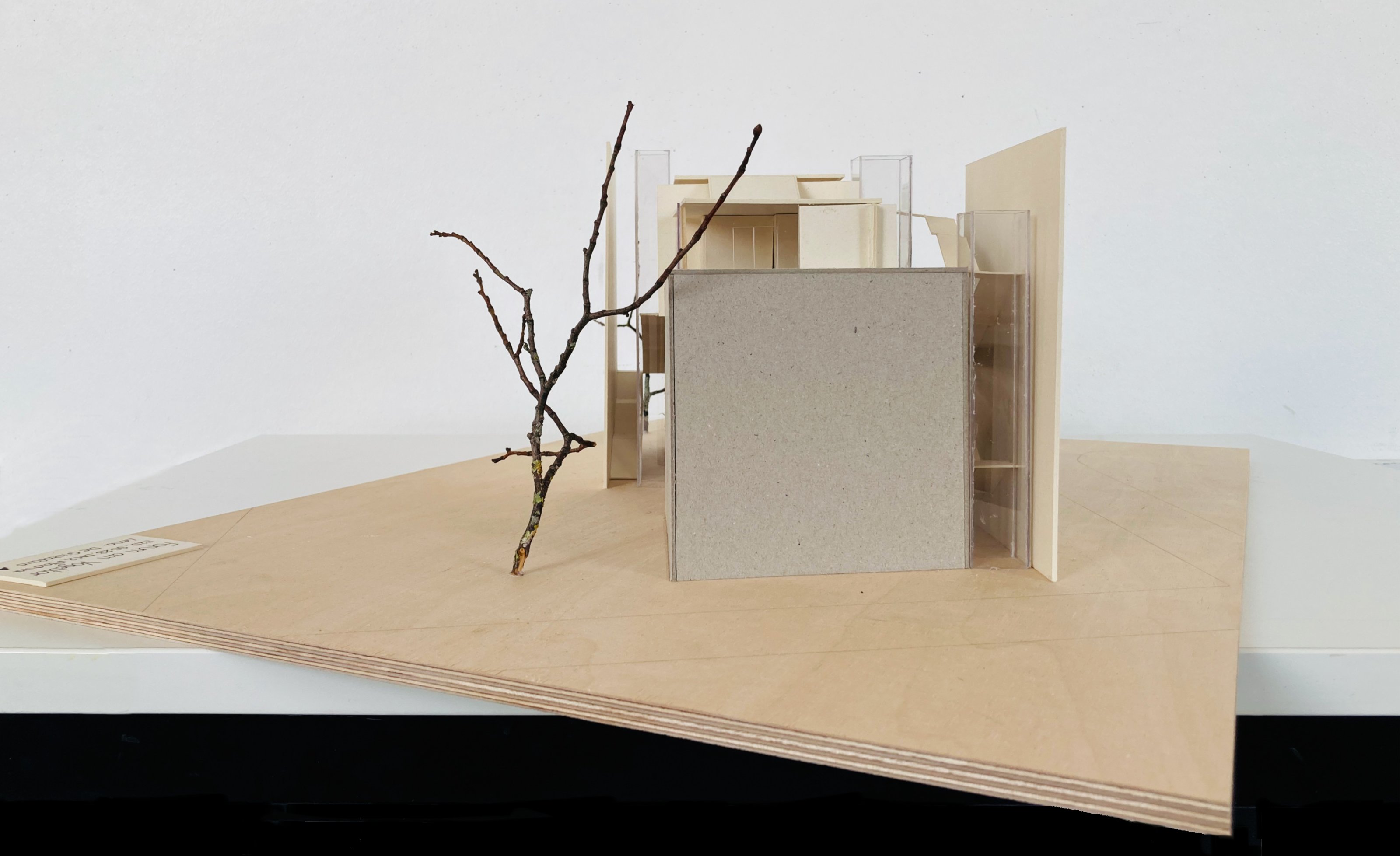 Eine Bindung: Nach der Beschäftigung mit dem Thema des "Körpers" im Wintersemester wurde in dieser Aufgabe untersucht, wie durch die Verbindung von Flächen (Decken und Wänden) Raum gebildet werden kann. Hierzu konnten die Studierenden aus den Kompositionsmethoden Faltung, Steckspiel oder Schichtung wählen.