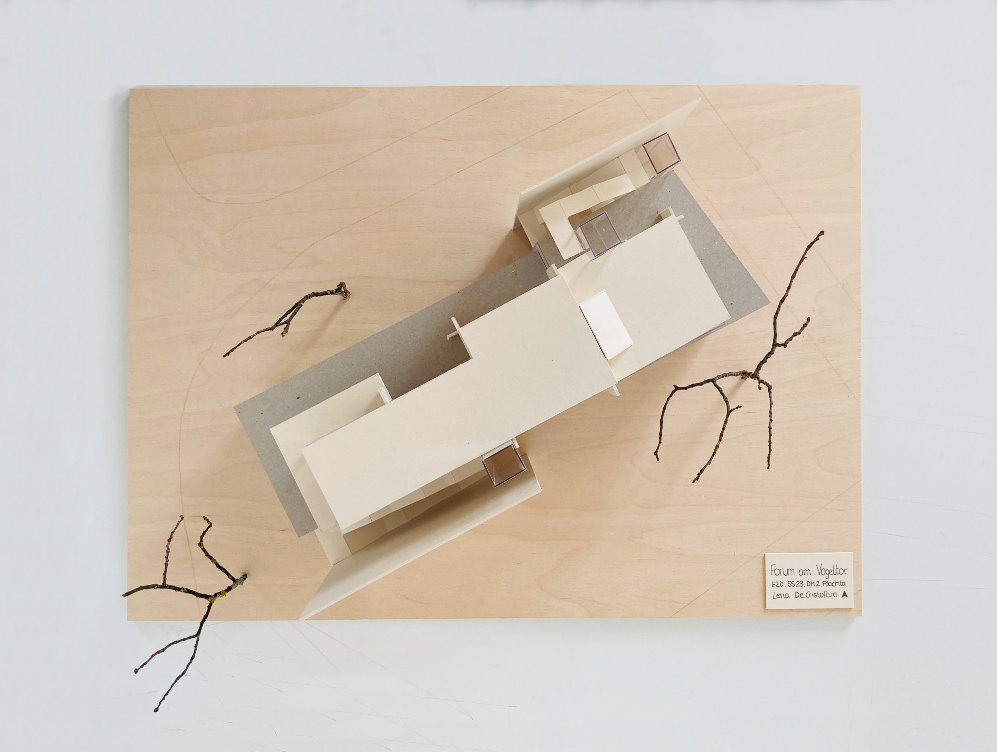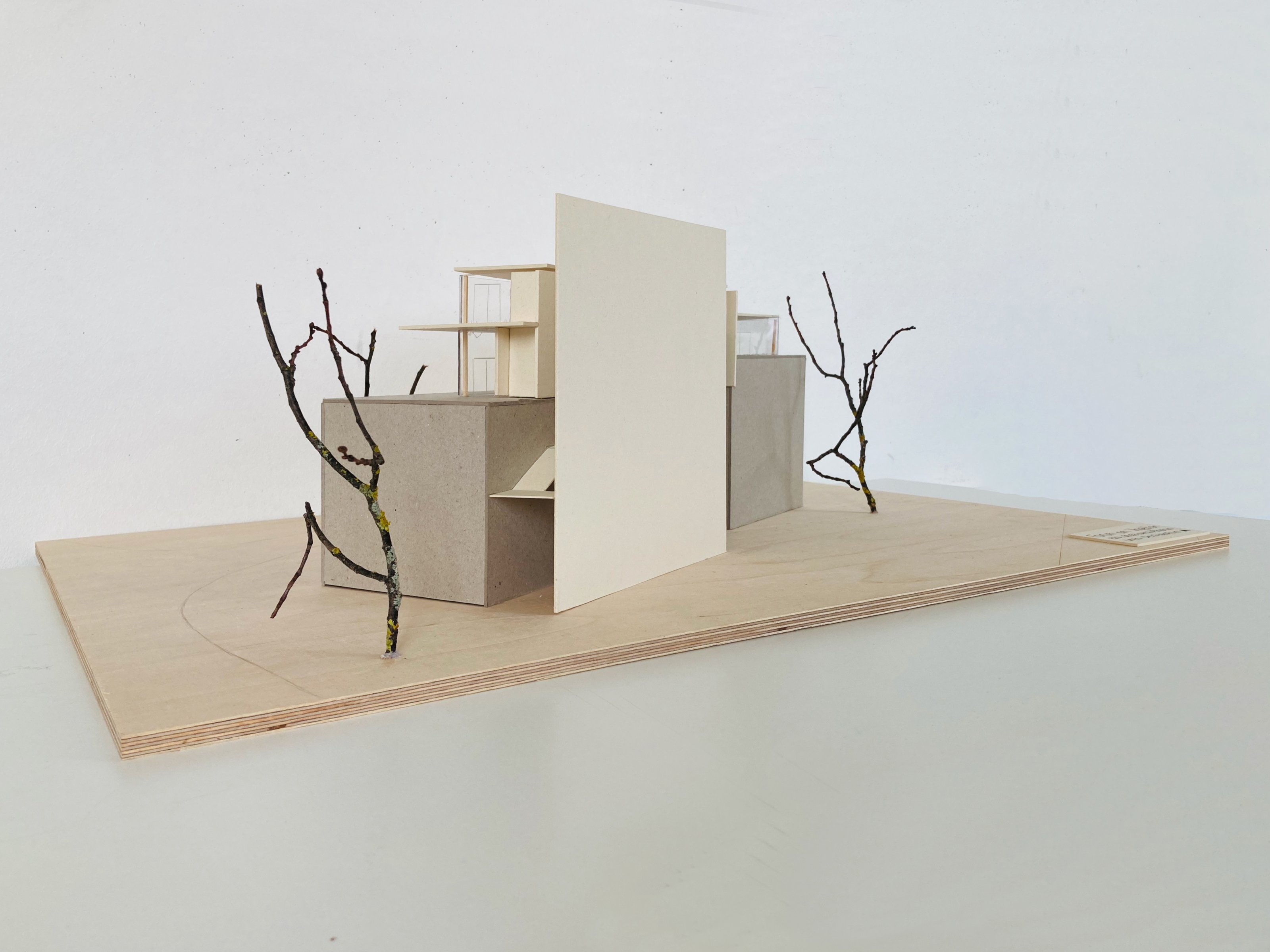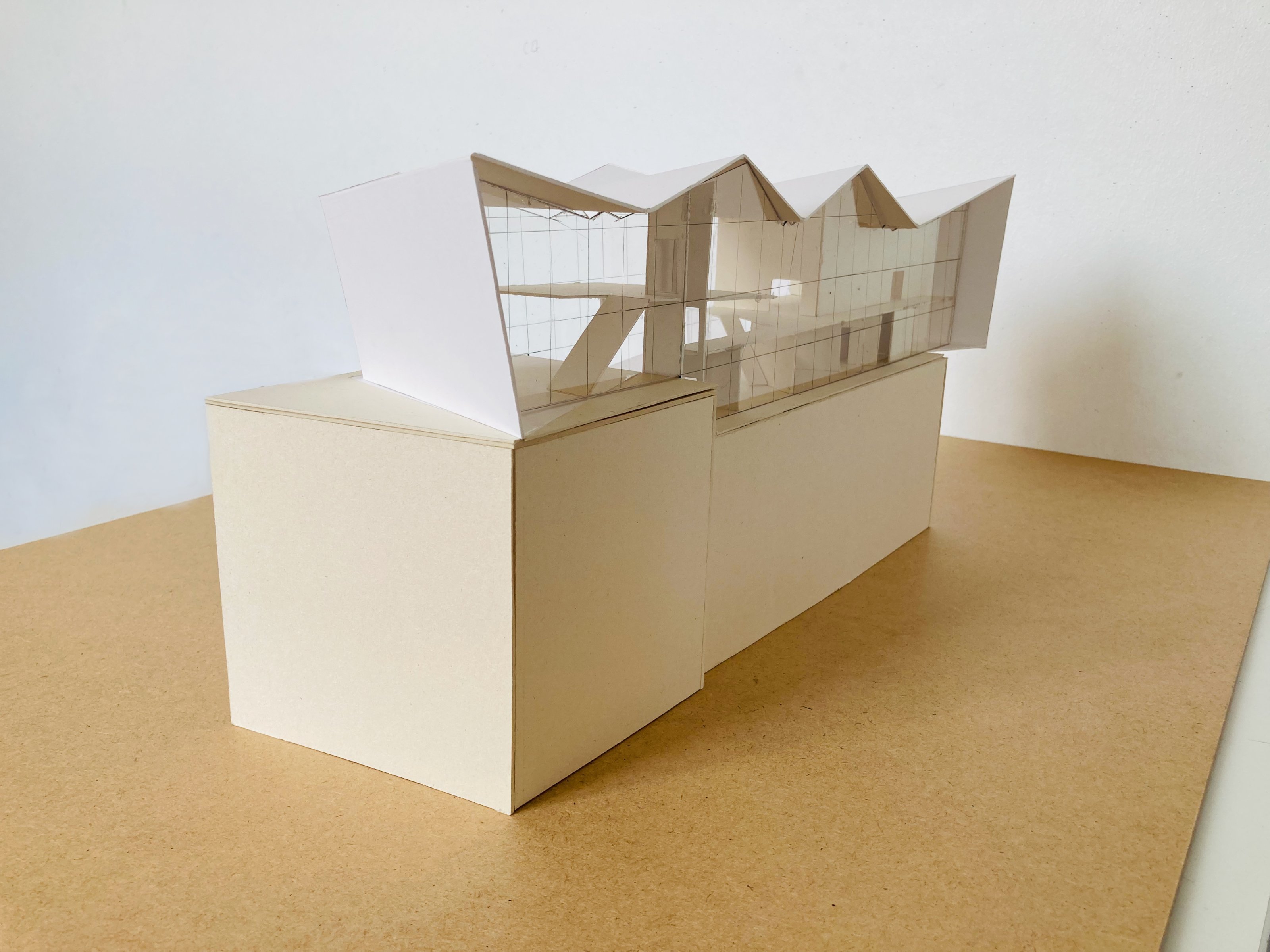 Eine Bindung: Nach der Beschäftigung mit dem Thema des "Körpers" im Wintersemester wurde in dieser Aufgabe untersucht, wie durch die Verbindung von Flächen (Decken und Wänden) Raum gebildet werden kann. Hierzu konnten die Studierenden aus den Kompositionsmethoden Faltung, Steckspiel oder Schichtung wählen.