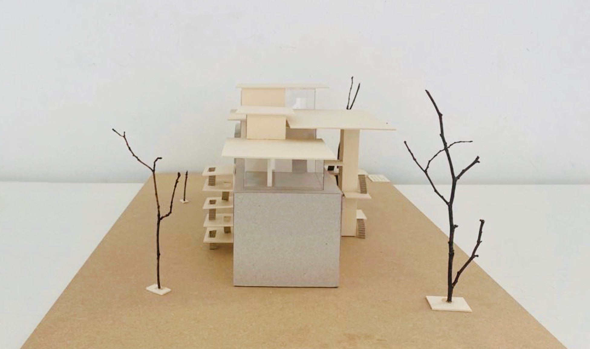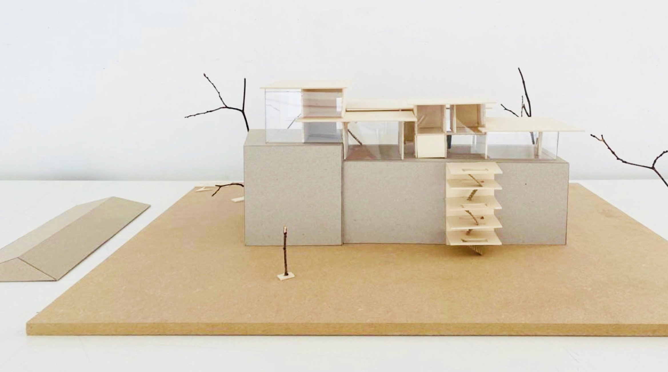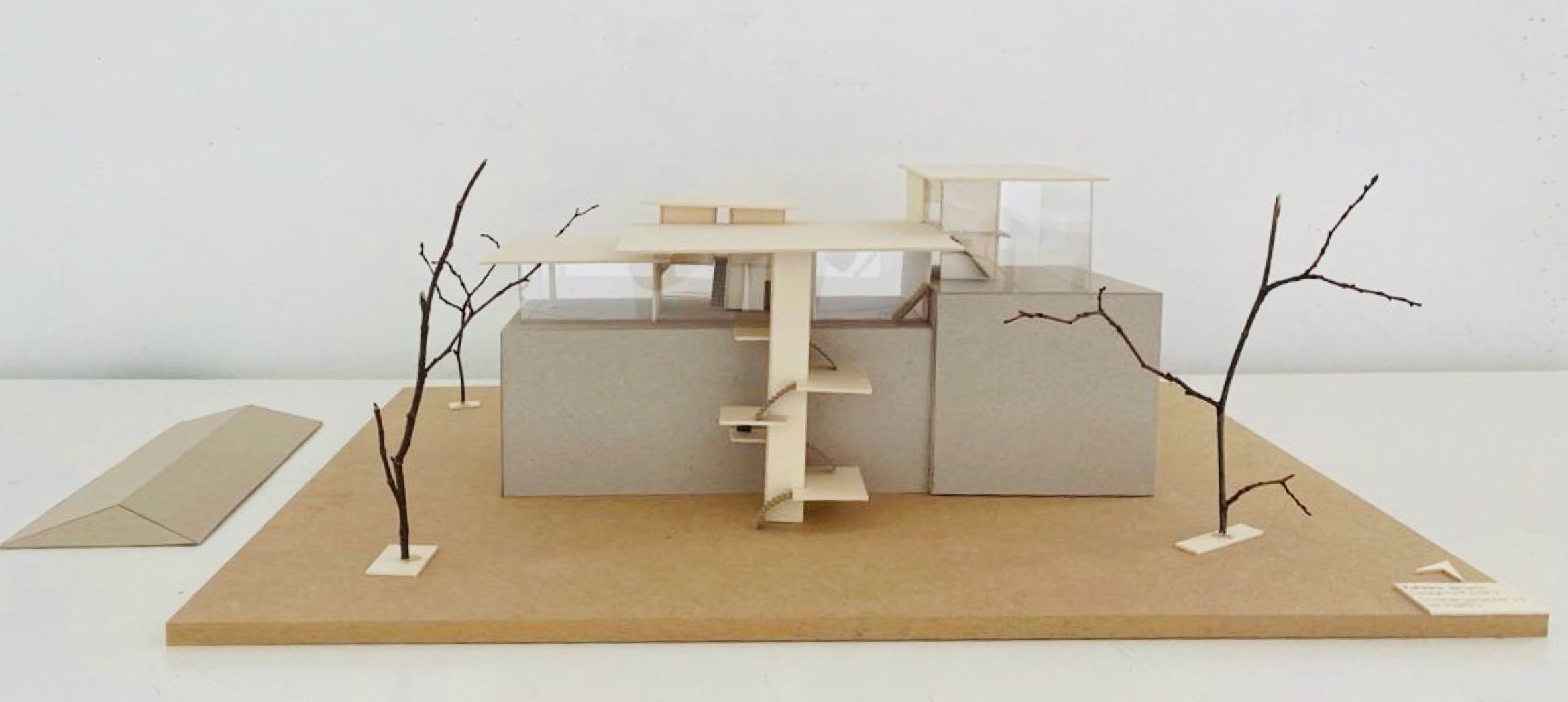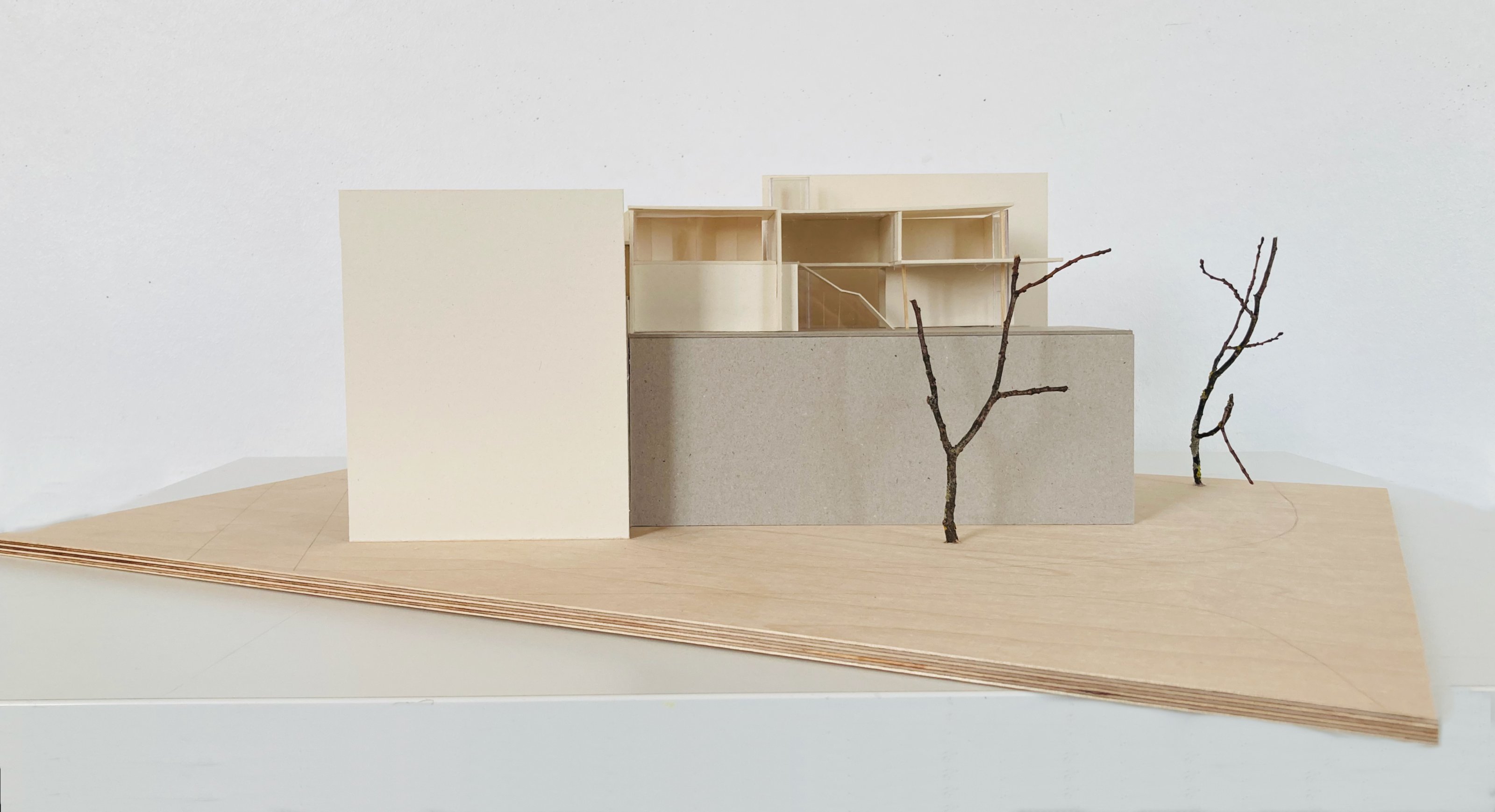 Eine Bindung: Nach der Beschäftigung mit dem Thema des "Körpers" im Wintersemester wurde in dieser Aufgabe untersucht, wie durch die Verbindung von Flächen (Decken und Wänden) Raum gebildet werden kann. Hierzu konnten die Studierenden aus den Kompositionsmethoden Faltung, Steckspiel oder Schichtung wählen.
