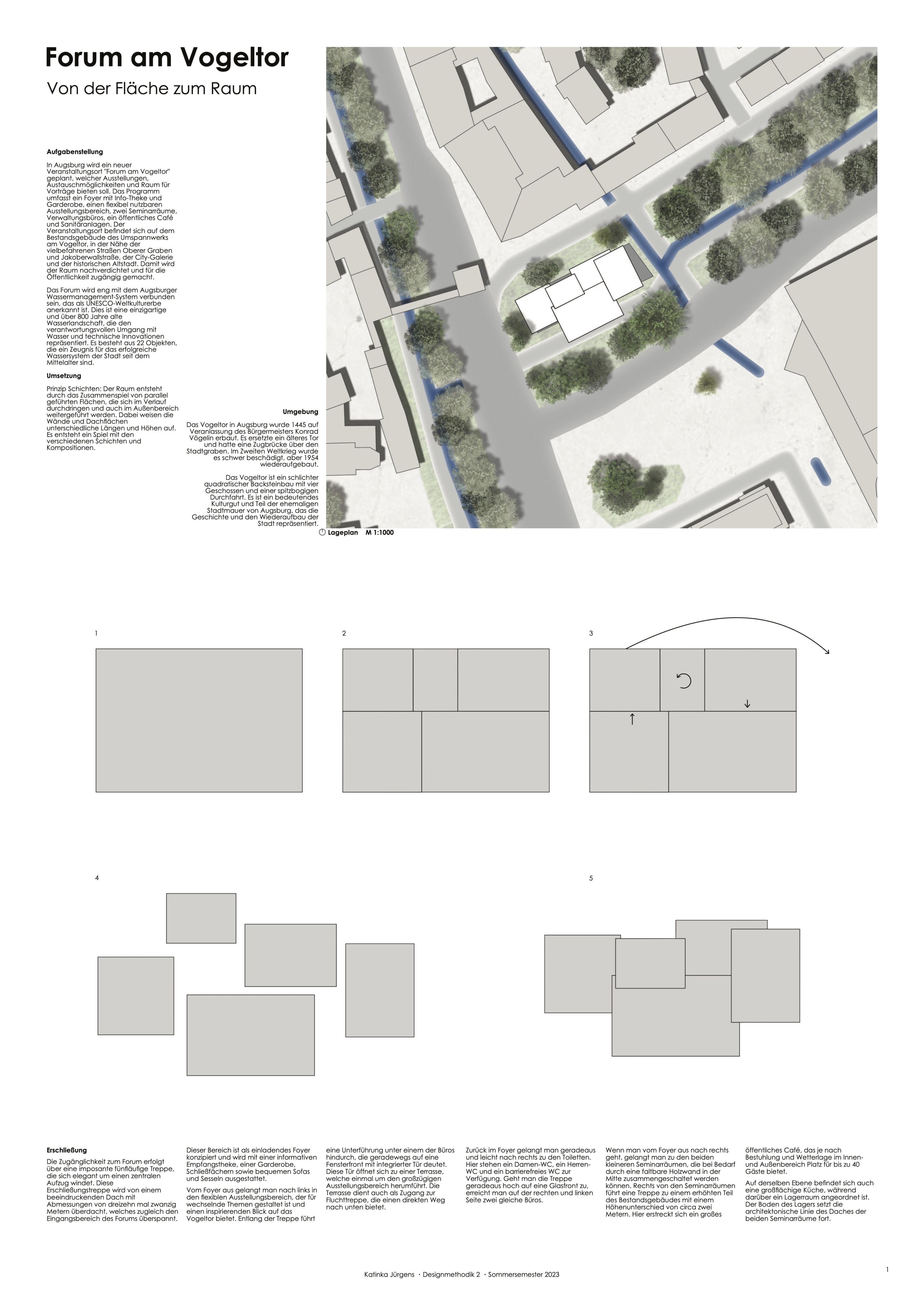 Freie Dachflächen in der Augsburger Innenstadt bieten ein großes Potential zur Nachverdichtung. Das Umspannwerk am Vogeltor ist solch ein Gebäude, in direkter Nähe zum Torturm, den vielbefahrenen Straßen Oberer Graben und Jakoberwallstraße, der City-Galerie und der historischen Altstadt. Mit dem Vogeltor verbunden ist die historische Stadtbefestigung und ein Brunnenwerk zur Versorgung des Lechviertels, ursprünglich 1538 errichtet, bevor 1774 dann ein Wehrturm der Stadtmauer zum Brunnenturm umfunktioniert. An dieser Stelle wird auch der Äußere Stadtgraben unter der Mauer hindurch geleitet und zum Inneren Stadtgraben. 2019 wurde das historische Wassermanagement-System Augsburgs als Unesco-Weltkulturerbe anerkannt.