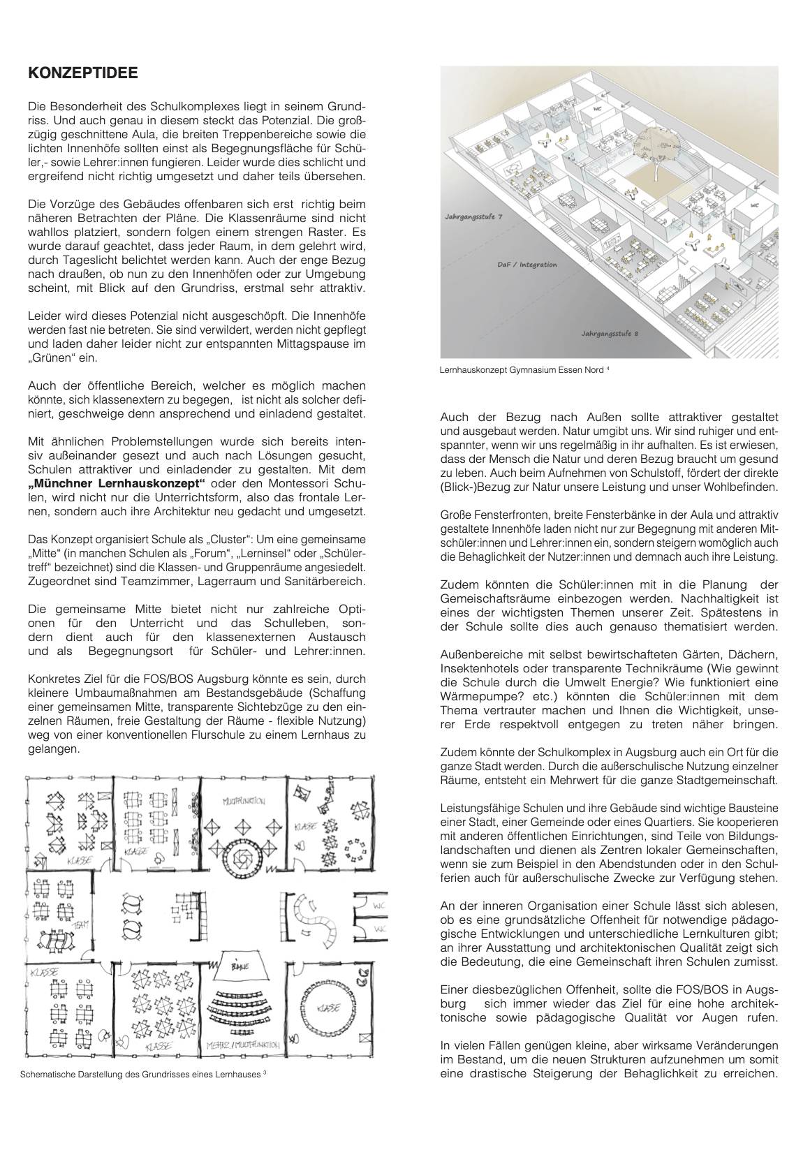 Ich habe mich mit der FOS/BOS Augsburg befasst. Hierbei habe ich anfangs über mögliche Sanierungsarbeiten nachgedacht, diese Herangehensweise jedoch letztlich verworfen. Die Arbeit beschäftigt sich nun intensiv mit dem Konzept Schule im Allgemeinen und wie Architektur dazu beitragen kann, Bildungseinrichtungen attraktiver und der Zeit angemessener zu gestalten. Diese Überlegungen habe ich im konzeptionellen Teil auf die FOS/BOS angewendet.