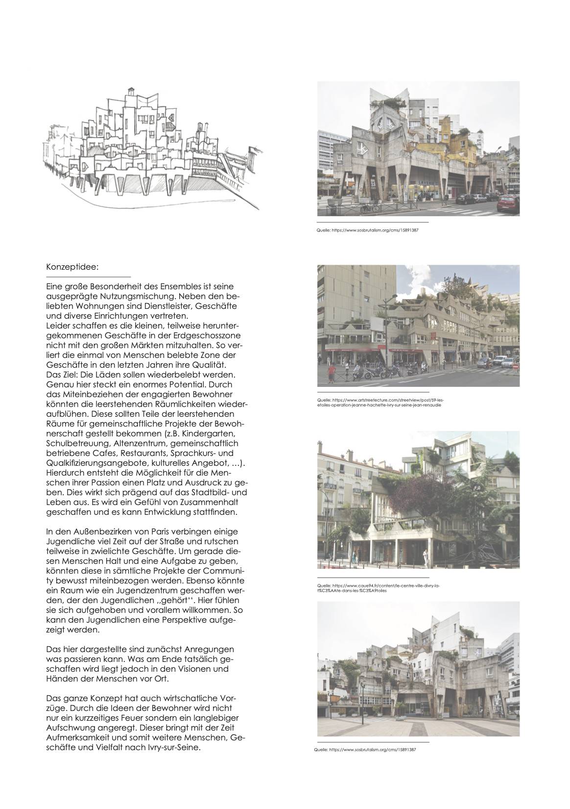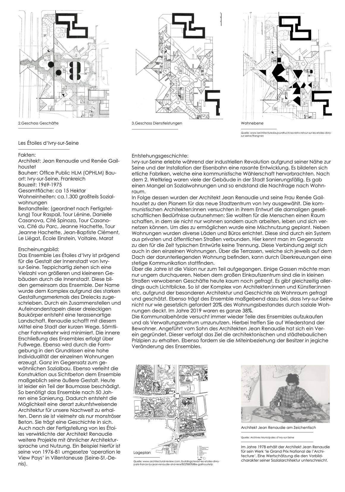 Mein Kommilitone Joshua Helber hat sich mit der Innenstadt von Ivry-sur-Seine (Ensamble Les Ètoiles d‘lvry) in Frankreich beschäftigt. Seine Analyse geht auf das Potential der im Erdgeschoss des Ensembles befindlichen Geschäftszone ein. Die Möglichkeiten diese Räume wiederzubeleben wurden in einem Konzept, welches auch die Ideen der Bewohner:innen des Gebäudes mit einbezieht, herausgearbeitet.