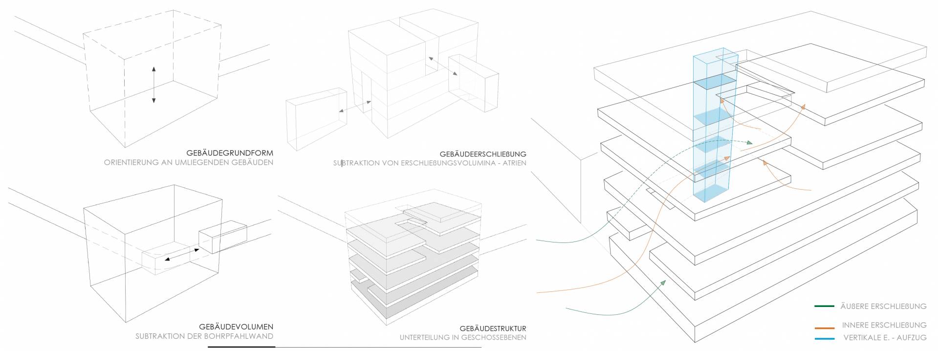 Der zunächst kompakt wirkende Kubus wird hierbei durch Subtraktion der angrenzenden Bohrpfahlwand, sowie des kreuzweise verlaufenden Treppenkerns in eine innere Struktur gebracht.