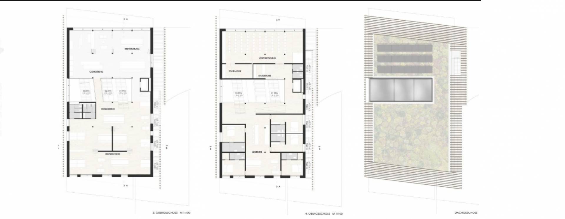 Der mehrgeschossige Baukörper soll als vorgehängt hinterlüftete Holzständerkonstruktion mit Geschossdecken aus Brettstapelholz und einem extensiven Gründach geplant werden. Durch eine Aufständerung, sowie dem Verzicht auf ein Kellergeschoss konnte die Bodenplatte ebenfalls aus gedübelten Brettstapeldecken realisiert werden. Die mittels EPDM Folie abgedichtete Platte liegt hierbei vollflächig auf Schaumglasschotter auf. Dieser wir im Wesentlichen aus Altglas gewonnen und übernimmt sowohl wärmedämmende, kapillarbrechende, als auch drainierende Funktionen.