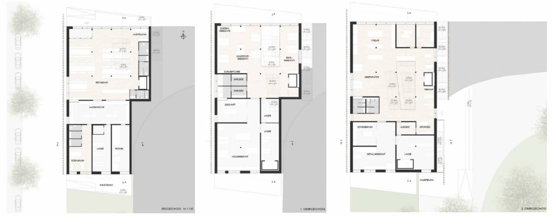 So kann bei einem Kaffee ein Einblick in das Geschehen der darüber liegenden offenen Werkstätten gewonnen, theoretisch entwickelten Ideen von Startups (Coworking 3. OG) erprobt und in die Realität umgesetzt (Werkstätten 1.-2.OG), sowie verschiedenste Kurse, Workshops und Veranstaltungen in den obersten Geschossen abgehalten werden.