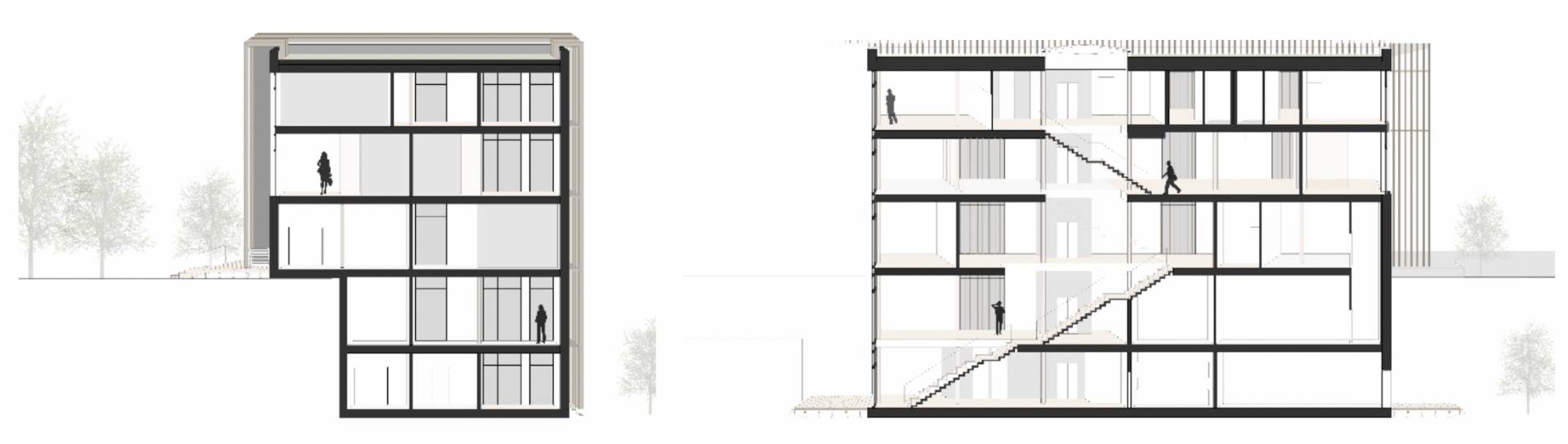 Der entstehende Luftraum - welcher über Falttreppen, sowie Brücken erschlossen wird - soll die verschiedenen Gebäudenutzungen sowohl räumlich, als auch visuell miteinander verbinden und offene Kommunikationsbereiche schaffen.