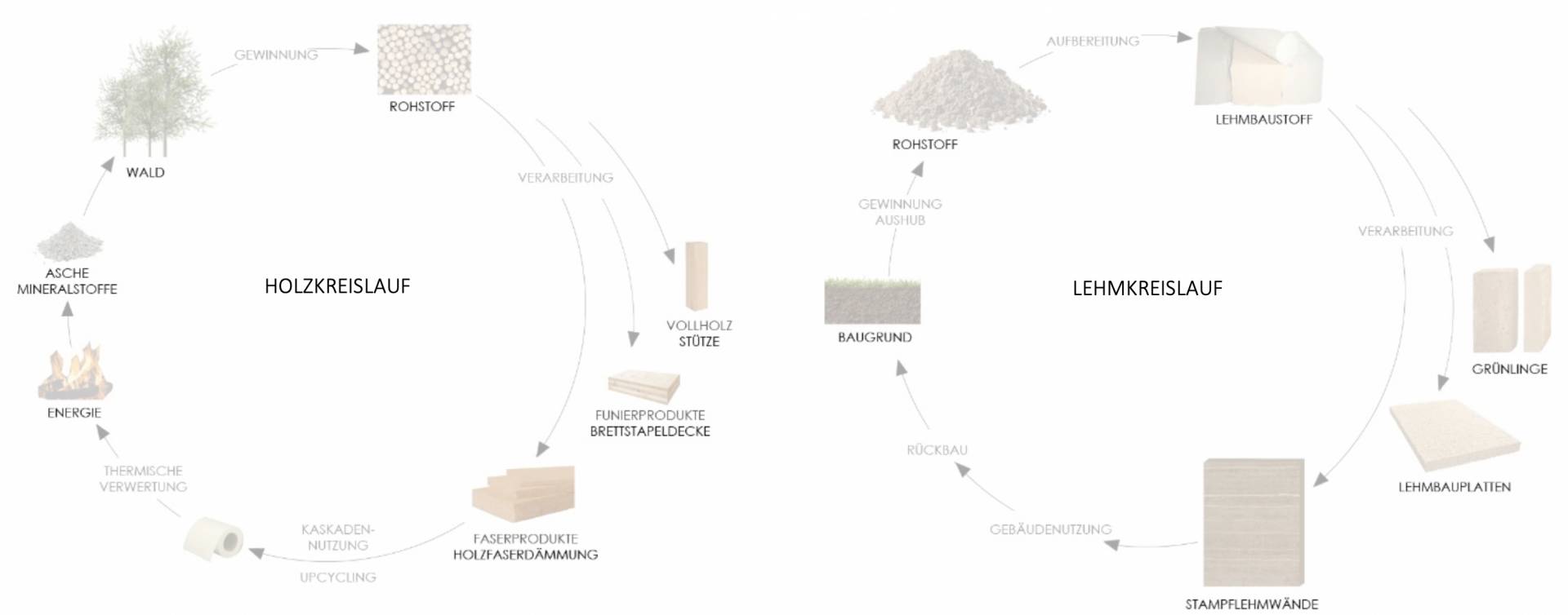 Aufgrund der geringen Wärmespeicherkapazität von Holz wurden zusätzlich Stampflehmwände sowie Lehmbauplatten als thermische Speichermasse vorgesehen. Das Rohmaterial kann aus dem Aushub der Gründung gewonnen werden und stellt somit ein regionales Bauprodukt dar. Zudem reguliert Lehm die Feuchtigkeit im Innenraum und absorbiert, bzw. neutralisiert Schad- und Giftstoffe der Luft.