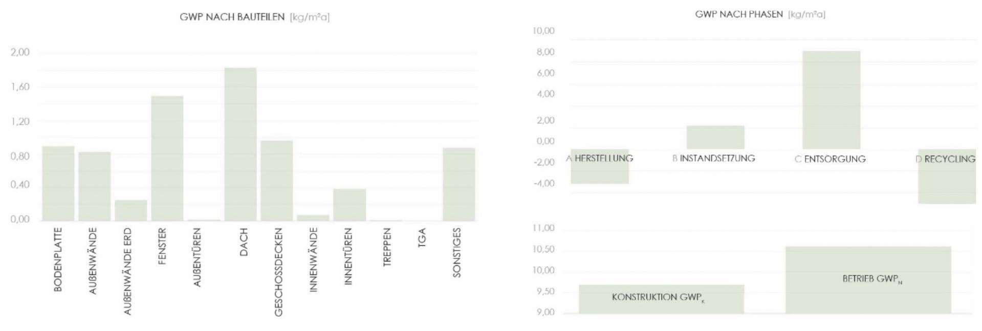 Für die durchgeführte Bilanzierung wurde insbesondere das Treibhauspotential GWP (global warming potential) untersucht. Hierbei wird das, in verschiedenen Lebensphasen freigesetzte CO2 der verschiedenen Baustoffe in Bezug zur Nettogrundfläche des Gebäudes berechnet.