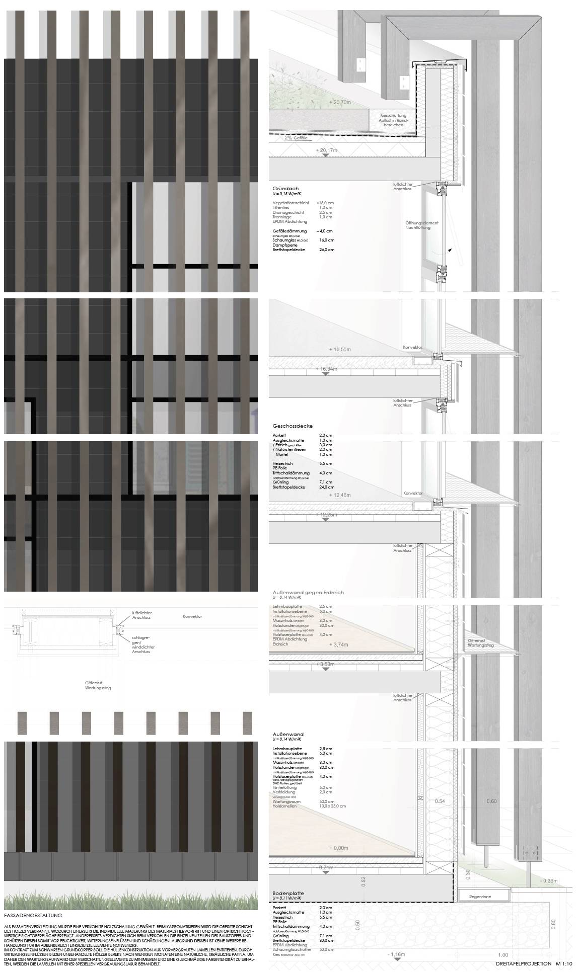 Für die Ermittlung der CO2 neutralsten Konstruktion wurde bereits während des Entwurfsprozesses ein Variantenvergleich verschiedener Außenwandkonstruktionen erstellt. Hierfür wurden Holzständer-, Massivholz- und Stahlbetonweise mit gleichwertigen Wärmedurchgangskoeffizienten konstruiert.