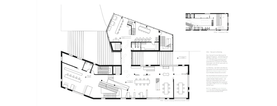 OG2 (Fab Lab/ Co-Working/ Textil, Druck & Keramik): Das „Fab Lab“ ist eine Werkstatt für digitale Produktion – deshalb liegt dort der Fokus auf einer Computerarbeitszeile mit einem gegenüberliegenden Arbeitsbereich. Ein Raum für flexible Nutzungen wie z.B. für Lasercutter ist ebenfalls vorhanden. Co-Working – das Teilen eines Büroarbeitsplatzes im Großraumbürostil - wird mit leichten Abtrennungen in Zonen durch flexiblen Elementen erreicht. Der Keramikbereich besteht aus einem zentralen gemeinsamen Arbeitstisch und flexiblen Töpferstühlen, mit denen der Arbeitsplatz durch den schnellen Zugang über den Lastenaufzug sogar in den Außenraum verlagert werden kann.