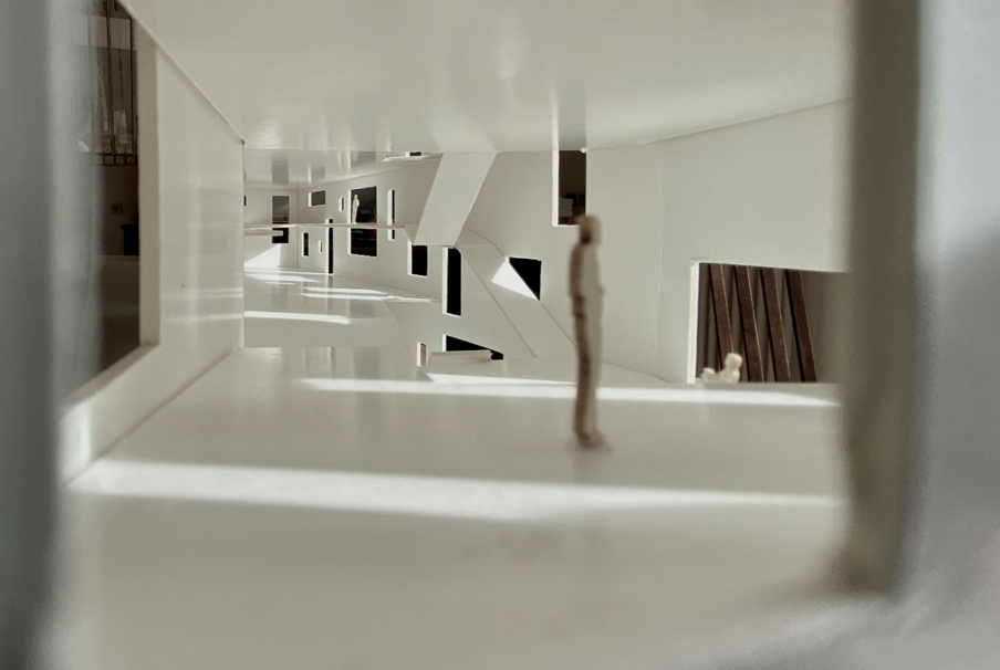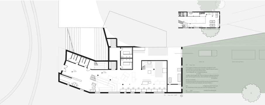 EG (Foyer/ Holzwerkstatt): Die Haupterschließung des Gebäudes erfolgt durch den monolithisch erscheinenden hellen Körper. Betritt man ihn, befindet man sich auch schon direkt an der zentralen Anlaufstelle – dem Infopunkt, der sich gleichzeitig als Werkzeugbibliothek und Mietfachladen versteht. Größere Werkzeuge oder Material können selbstverständlich auch dort bezogen werden, diese befinden sich allerdings im Kurzzeitlager mit angeschlossener Anlieferung im hinteren Teil des Gebäudes. Die Anordnung der Holzwerkstatt ist durch Arbeitstische mit Rollen flexibel, nach dem Motto: „Jeder nimmt sich den Platz den er gerade benötigt“. Die Kommunikation der Körper erfolgt unter der Freitreppe des Außenraums über eine barrierefreie Aufzugsanlage.