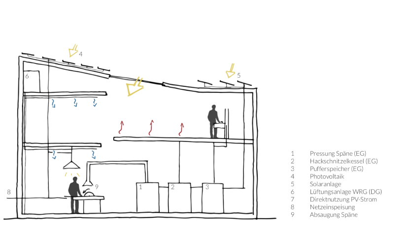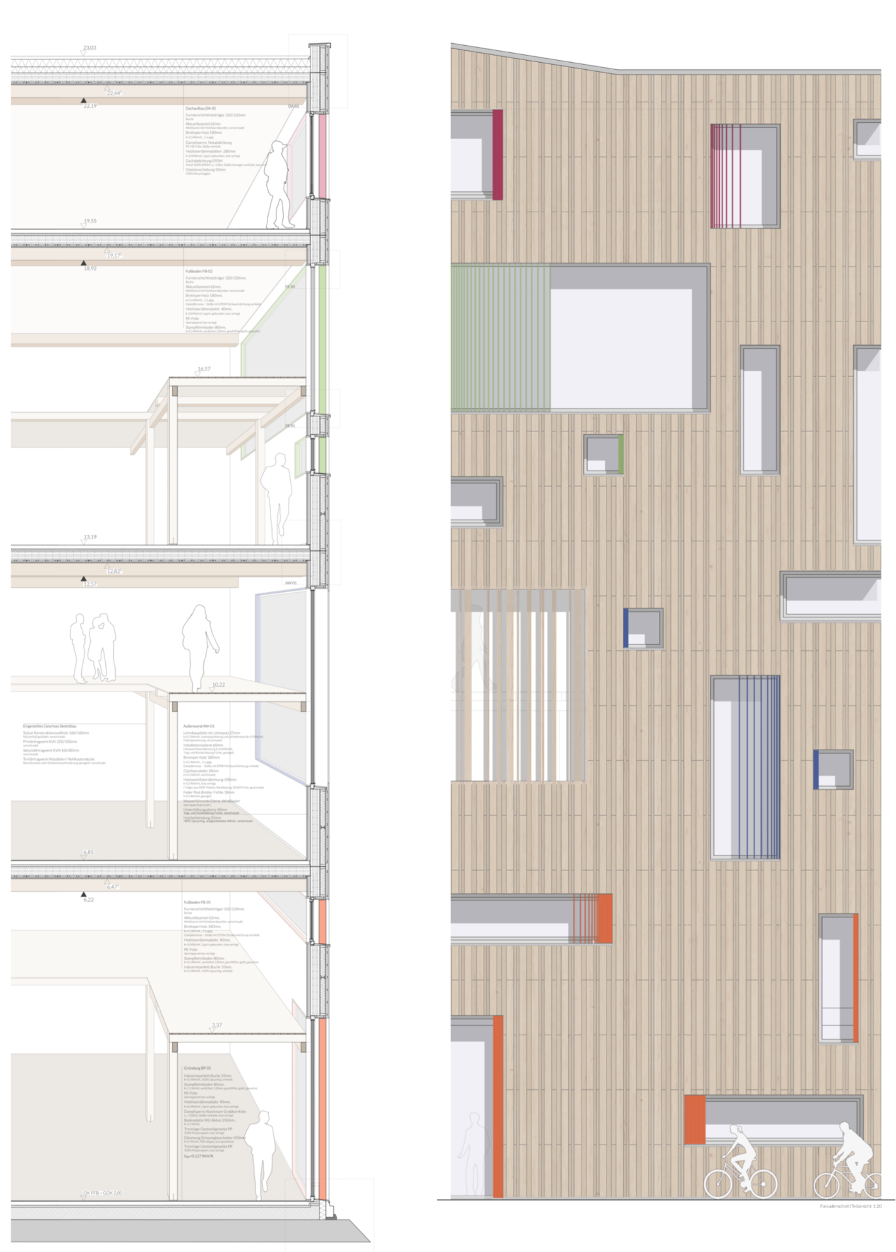 Holz: Der Einsatz von Holz oder Holzwerkstoffen wird versucht zu maximieren und sich seiner Eigenschaft als Kohlenstoffspeicher zu Nutze zu machen. Deshalb bestehen Wände, Treppen, eingestellte Geschosse, Träger, Stützen, Innenbekleidungen und Fenster aus dem Werkstoff Holz. Darüber hinaus werden auch sämtliche Dämmstoffe (außer erdberührte) aus Holzfaser verwendet. Es wird aufgrund von Schadstofffreiheit und Monomaterialität versucht, den Bindemittelanteil gering zu halten.