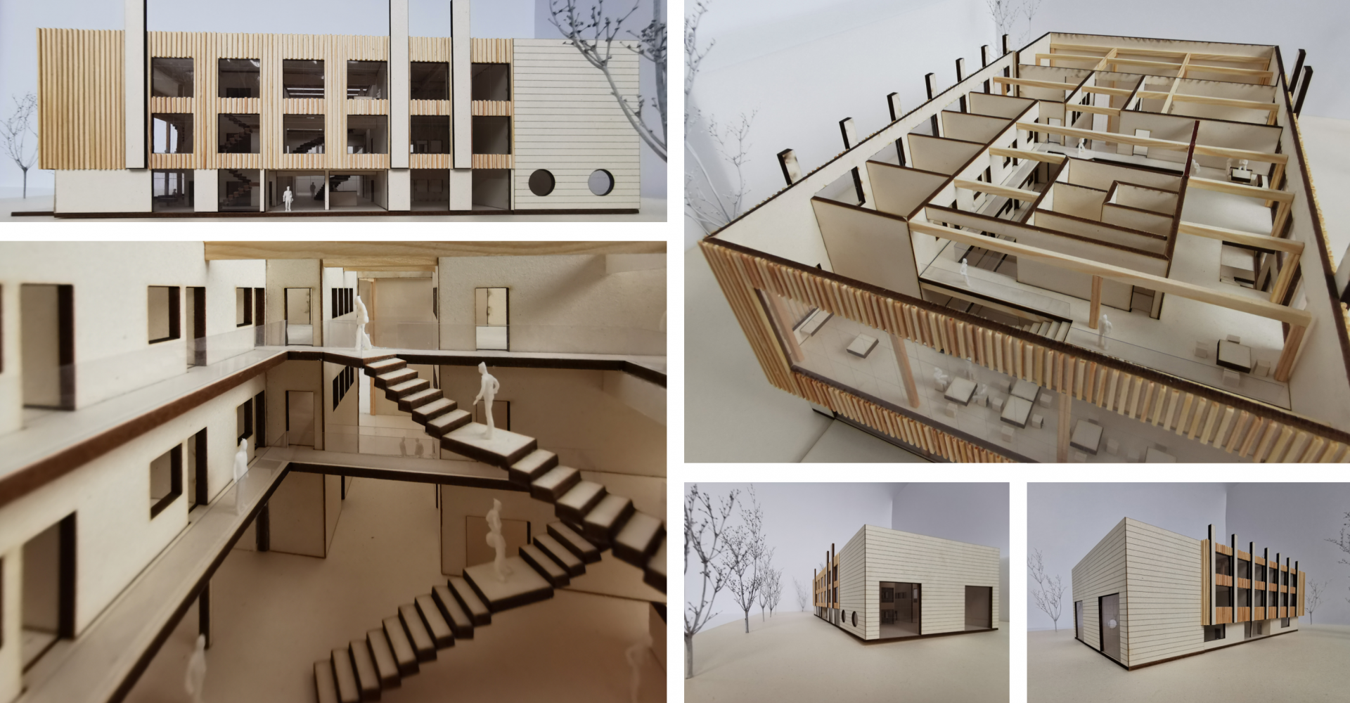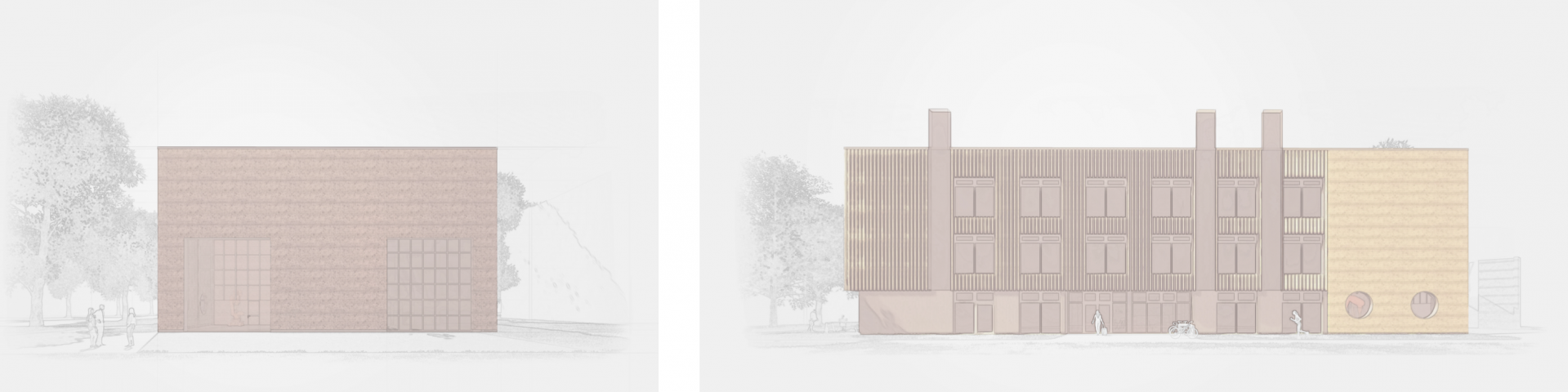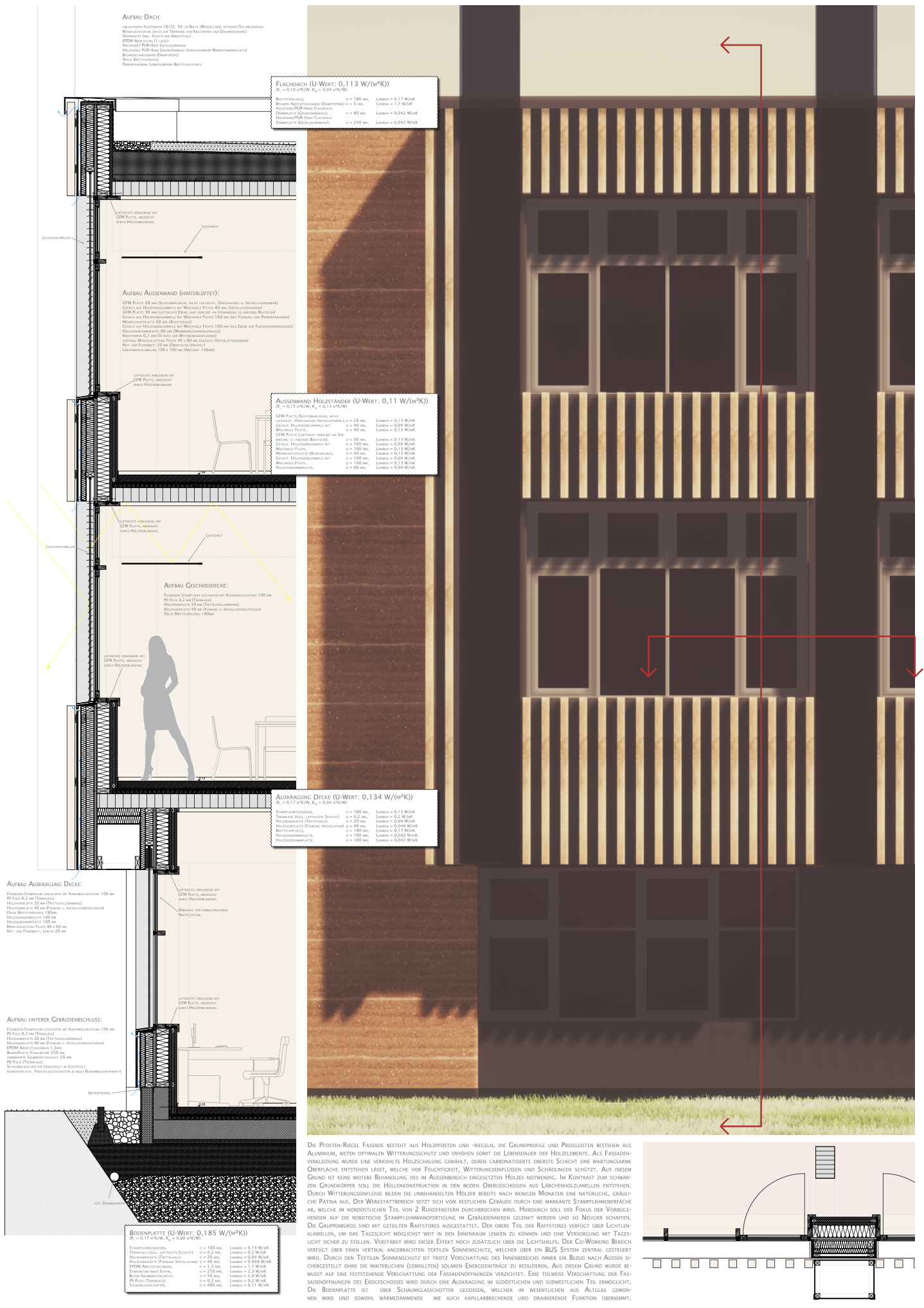 Die Pfosten-Riegel Fassade besteht aus Holzpfosten und -riegeln, die Grundprofile und Pressleisten bestehen aus Aluminium, bieten optimalen Witterungsschutz und erhöhen somit die Lebensdauer der Holzelemente. Als Fassadenverkleidung wurde eine verkohlte Holzschalung gewählt, deren carbonatisierte oberste Schicht eine wartungsarme Oberfläche entstehen lässt, welche vor Feuchtigkeit, Witterungseinflüssen und Schädlingen schützt. Aus diesem Grund ist keine weitere Behandlung des im Außenbereich eingesetzten Holzes notwendig. Im Kontrast zum schwarzen Grundkörper soll die Hüllenkonstruktion in den beiden Obergeschossen aus Lärchenholzlamellen entstehen. Durch Witterungseinflüsse bilden die unbehandelten Hölzer bereits nach wenigen Monaten eine natürliche, gräuliche Patina aus. Der Werkstattbereich setzt sich vom restlichen Gebäude durch eine markante Stampflehmoberfäche ab, welche im nordöstlichen Teil von 2 Rundfenstern durchbrochen wird. Hierdurch soll der Fokus der Vorbeigehenden auf die robotische Stampflehmwandfertigung im Gebäudeinneren gelenkt werden und so Neugier schaffen.