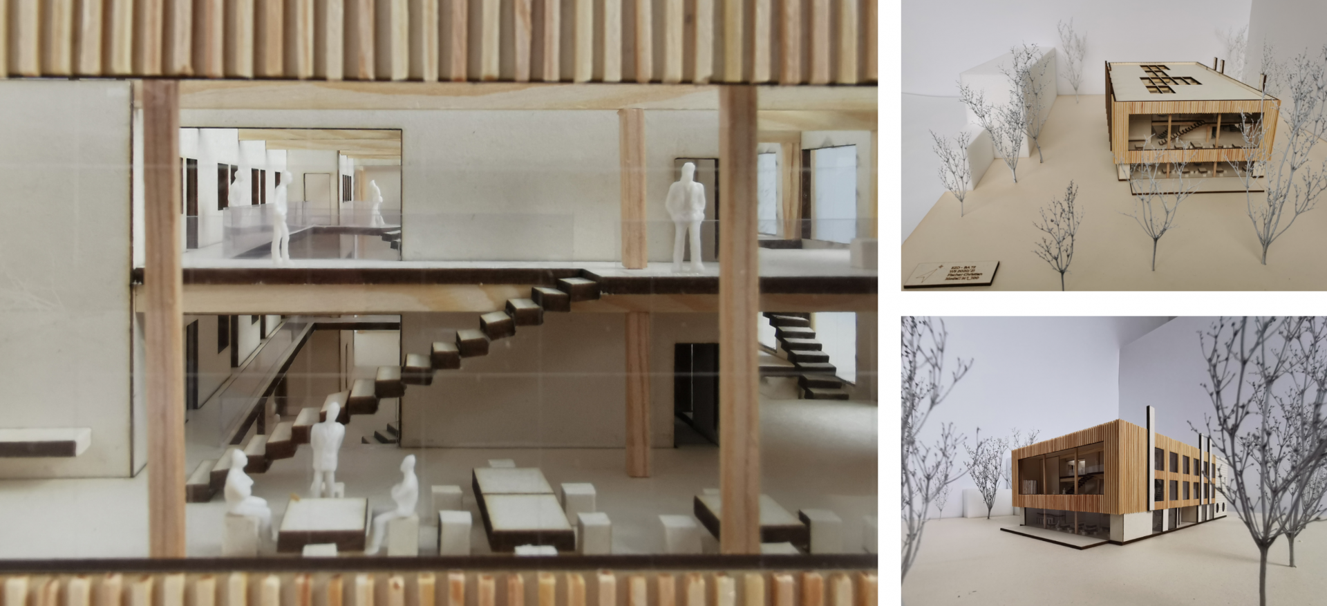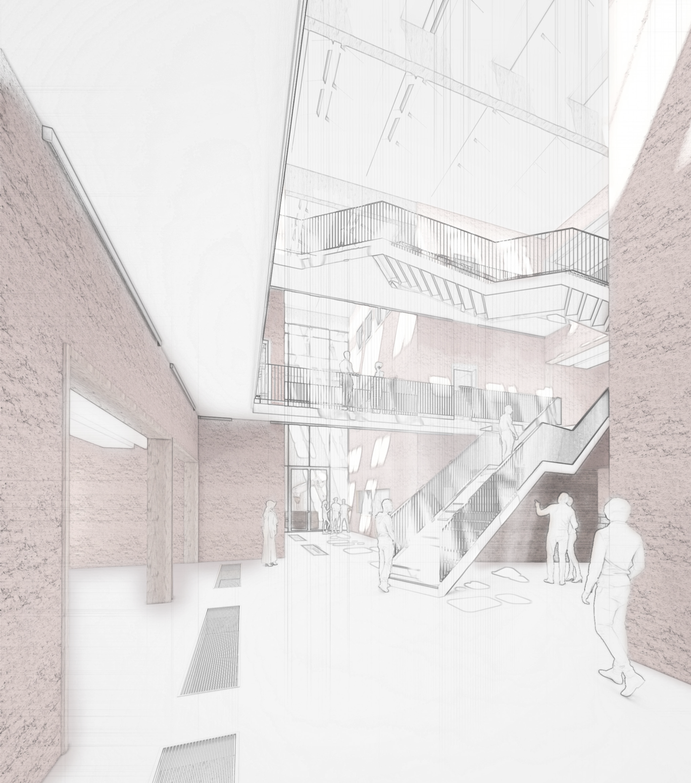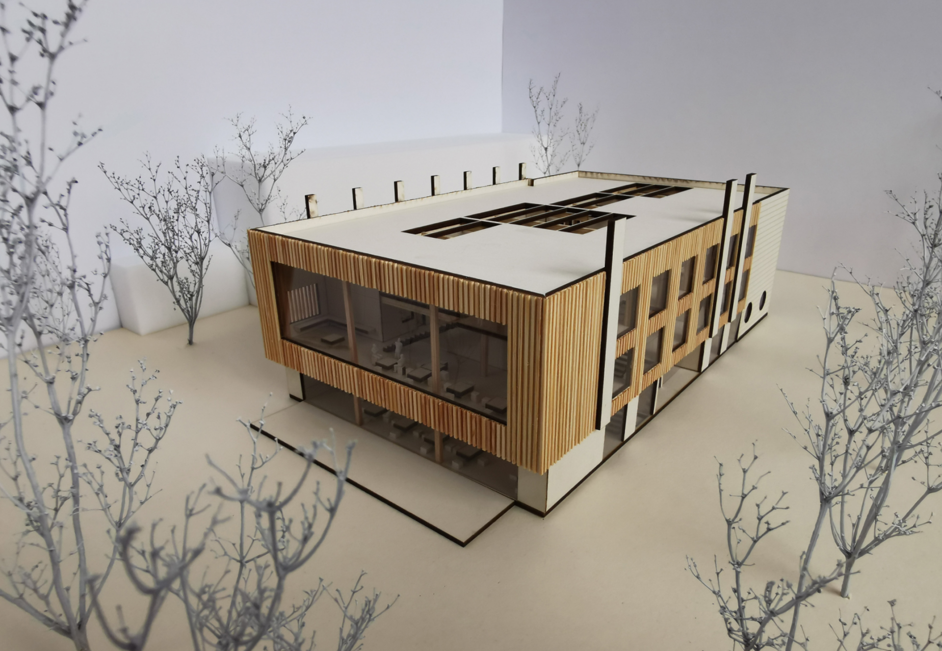 Die Pfosten-Riegel Fassade besteht aus Holzpfosten und -riegeln, die Grundprofile und Pressleisten bestehen aus Aluminium, bieten optimalen Witterungsschutz und erhöhen somit die Lebensdauer der Holzelemente. Als Fassadenverkleidung wurde eine verkohlte Holzschalung gewählt, deren carbonatisierte oberste Schicht eine wartungsarme Oberfläche entstehen lässt, welche vor Feuchtigkeit, Witterungseinflüssen und Schädlingen schützt. Aus diesem Grund ist keine weitere Behandlung des im Außenbereich eingesetzten Holzes notwendig. Im Kontrast zum schwarzen Grundkörper soll die Hüllenkonstruktion in den beiden Obergeschossen aus Lärchenholzlamellen entstehen. Durch Witterungseinflüsse bilden die unbehandelten Hölzer bereits nach wenigen Monaten eine natürliche, gräuliche Patina aus. Der Werkstattbereich setzt sich vom restlichen Gebäude durch eine markante Stampflehmoberfäche ab, welche im nordöstlichen Teil von 2 Rundfenstern durchbrochen wird. Hierdurch soll der Fokus der Vorbeigehenden auf die robotische Stampflehmwandfertigung im Gebäudeinneren gelenkt werden und so Neugier schaffen.